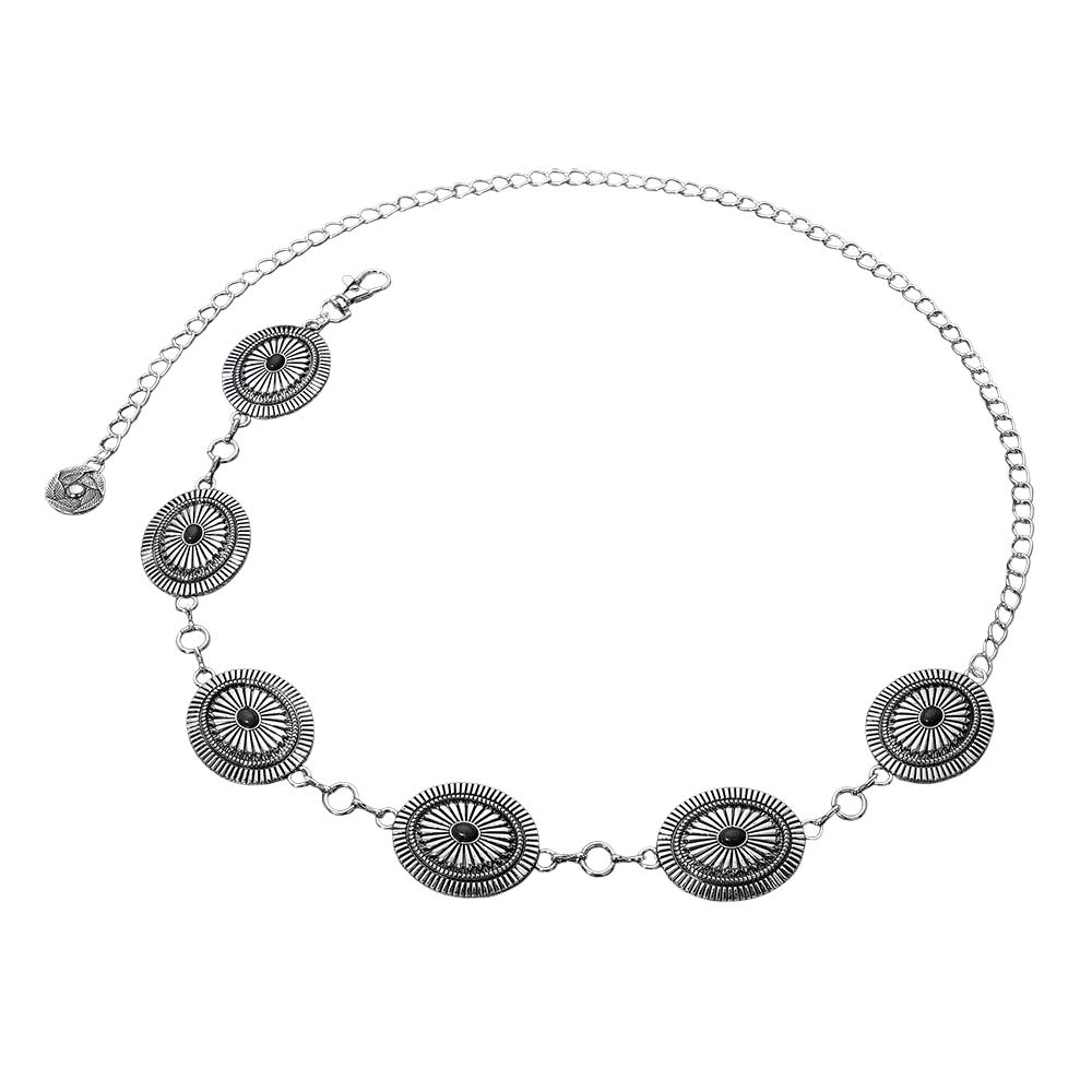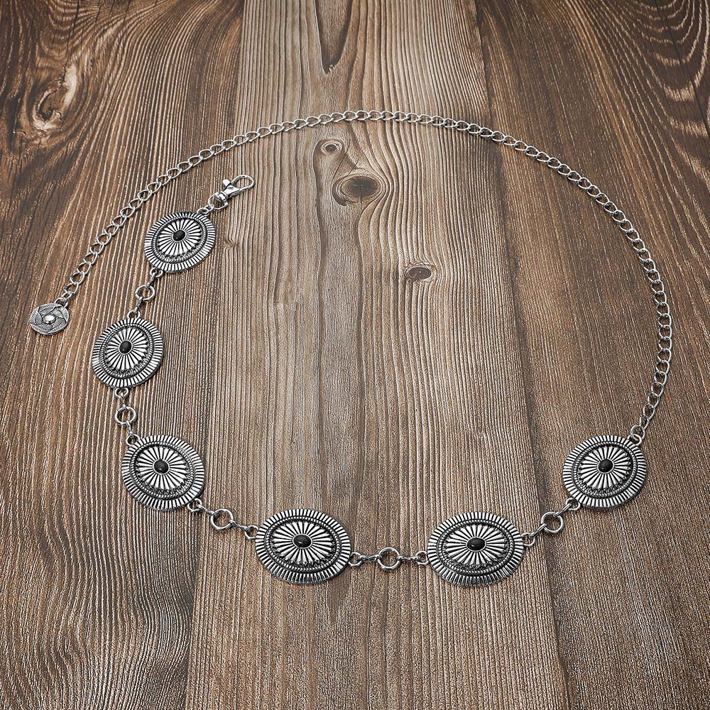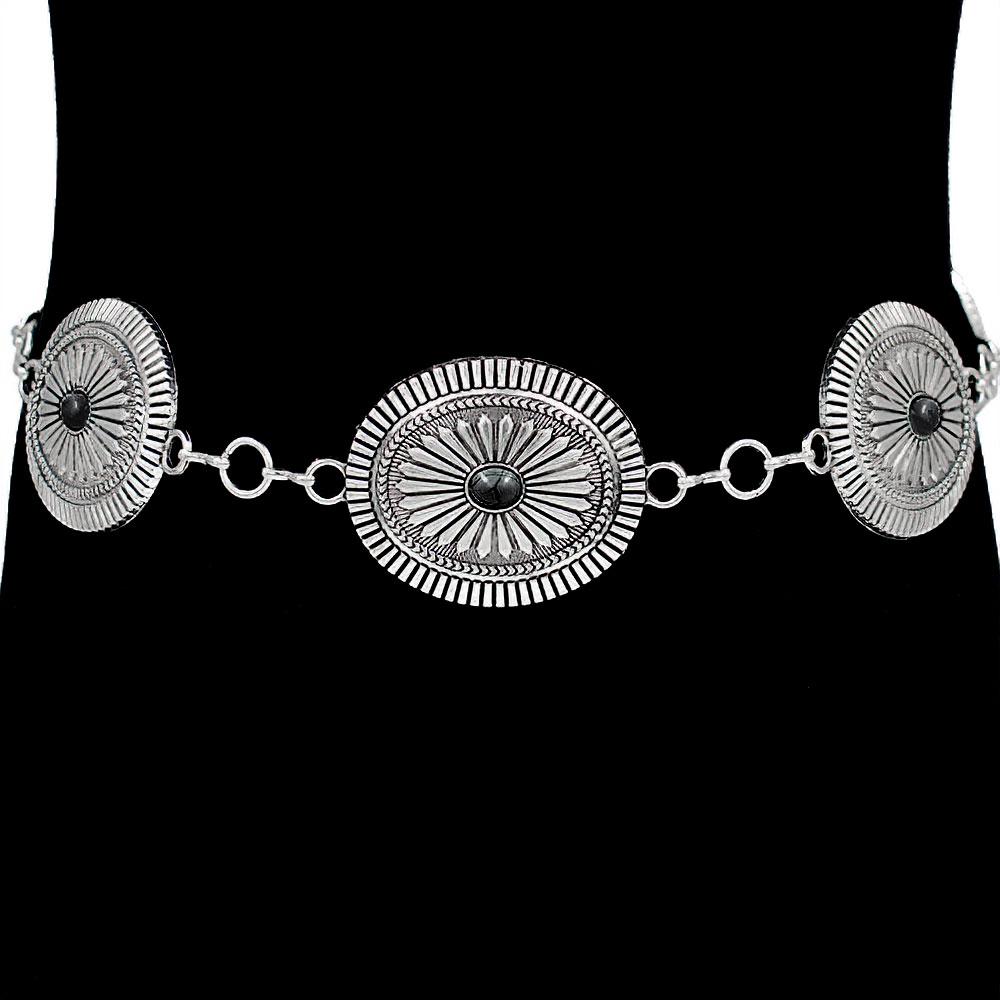 Details • Size : 1.5" H, 20" + 23" L • Add bold western flair to your outfit with this concho chain belt featuring detailed round medallions. Perfect for festivals, concerts, or casual wear, it pairs effortlessly with dresses, skirts, or jeans. Stylish, adjustable accessory that makes a statement.