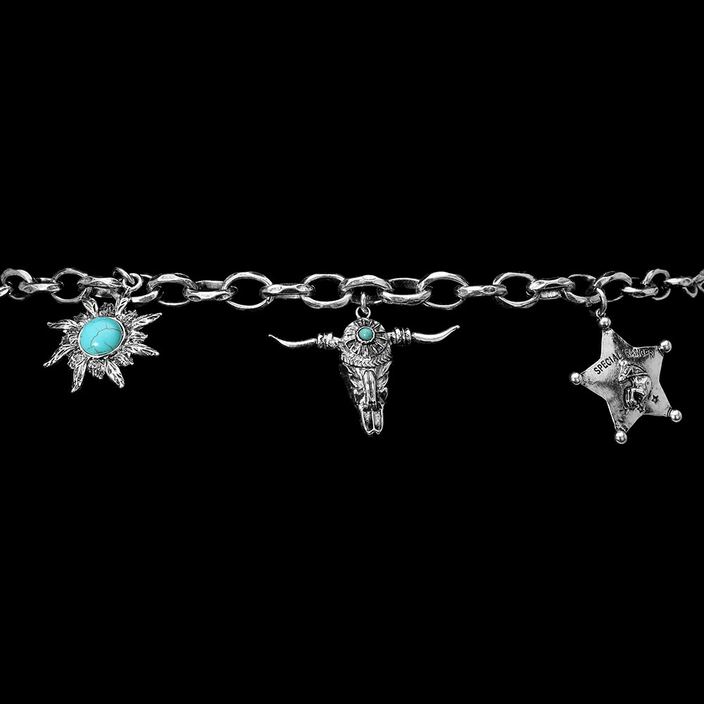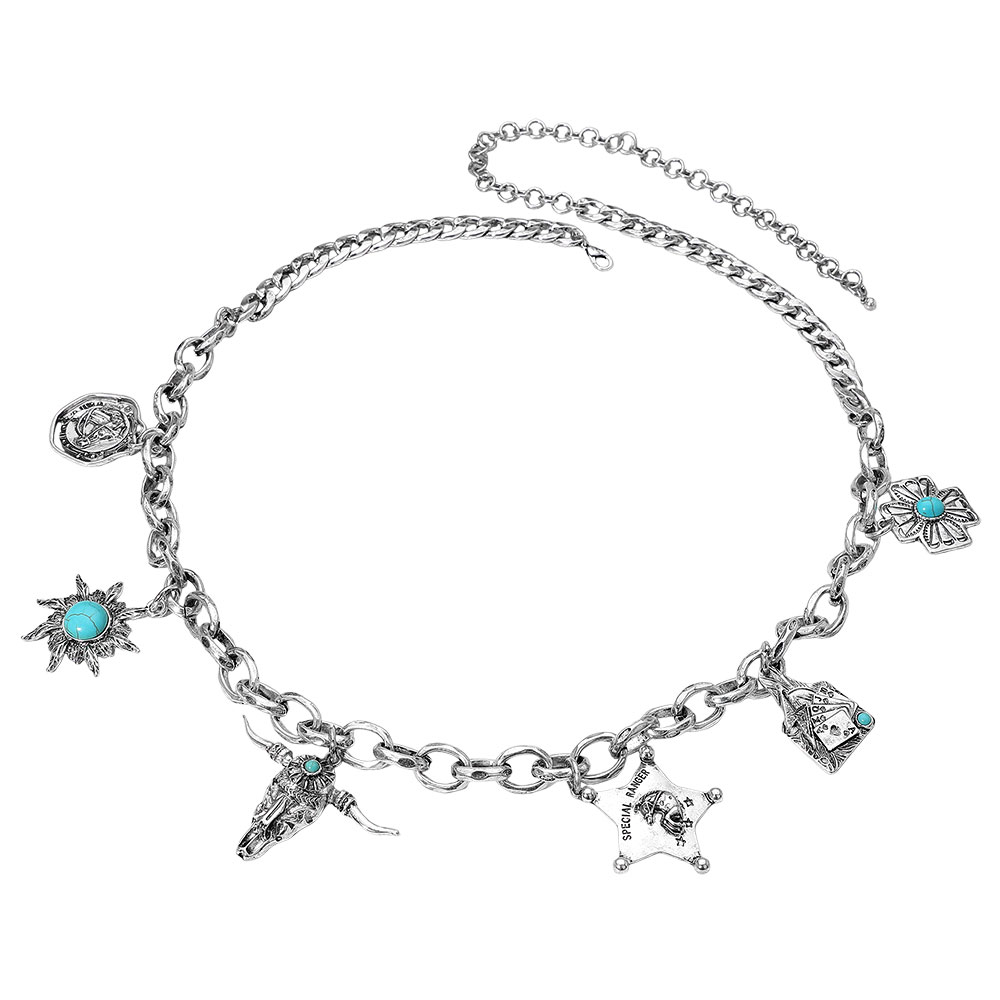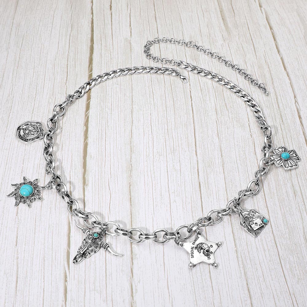 Details • Size : 2.3" H, 33" + 11" L • This Western-inspired chain waist belt features intricate charms including floral, star, and bull head motifs accented with turquoise-like details. Its adjustable design ensures a comfortable fit, making it the perfect statement accessory for elevating casual or boho-chic outfits. • Lead and Nickel Compliant
