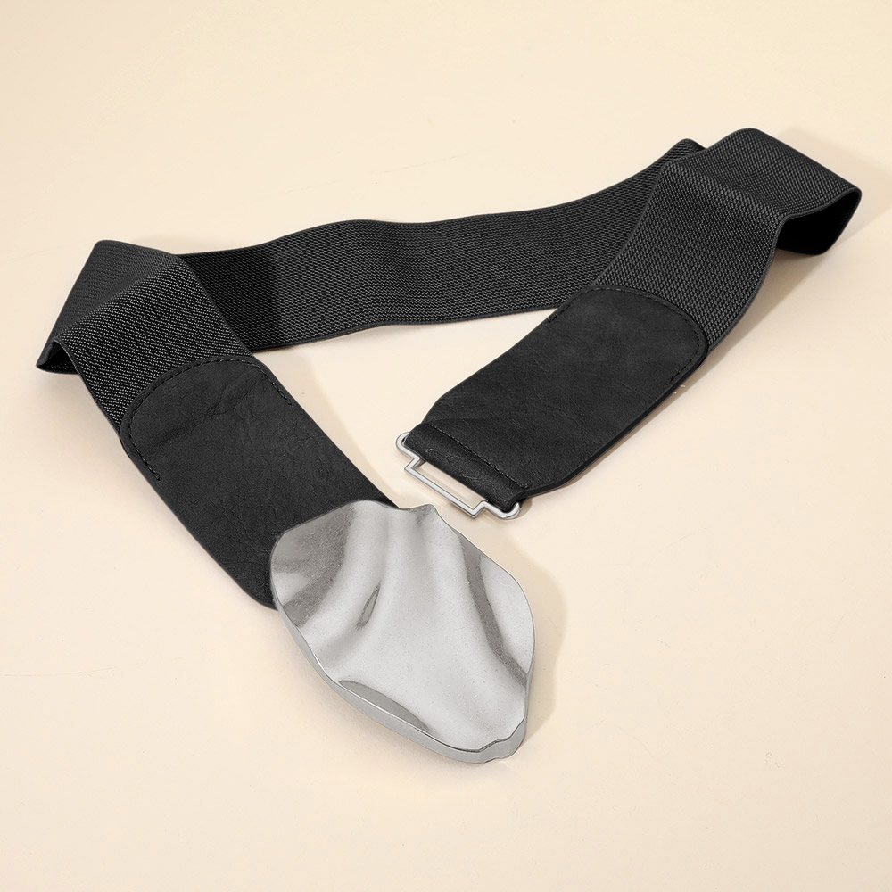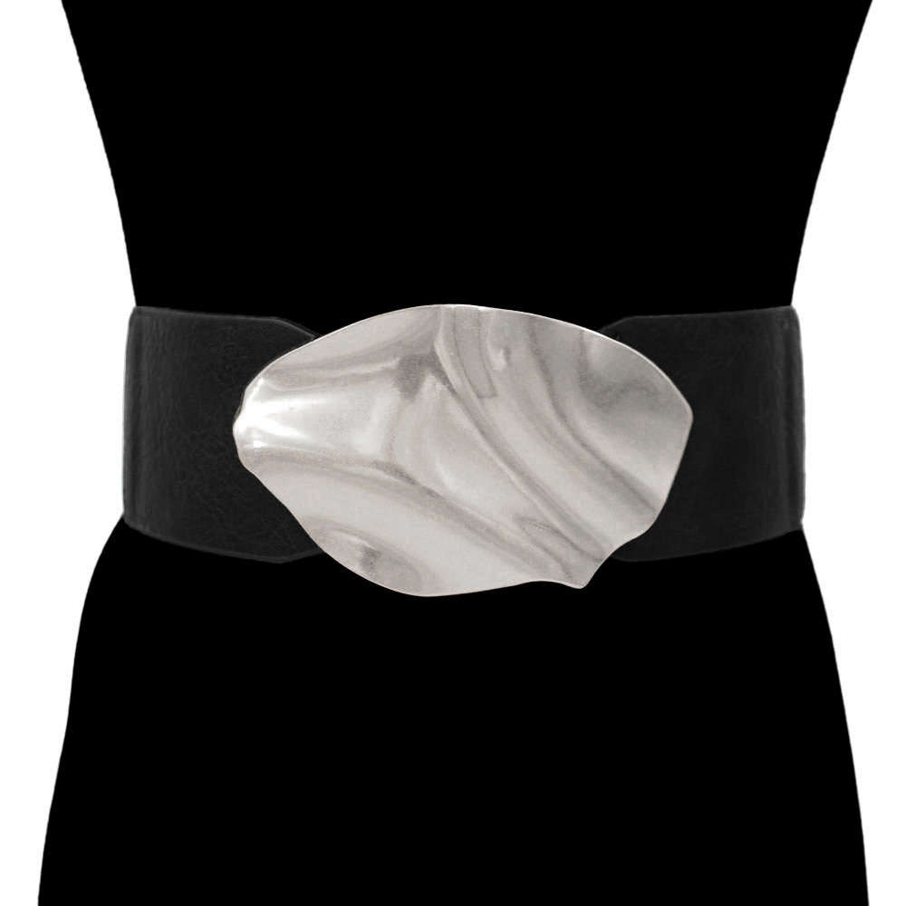 Details • Size : 2.8" H, 34" L • Stretchable • This abstract buckle wide waist belt makes a bold and artistic statement. Designed with a sculptural buckle and a sleek band, it adds a touch of modern sophistication to any outfit. Perfect for enhancing dresses or high-waist looks with a distinctive and elegant flair. • Lead and Nickel Compliant