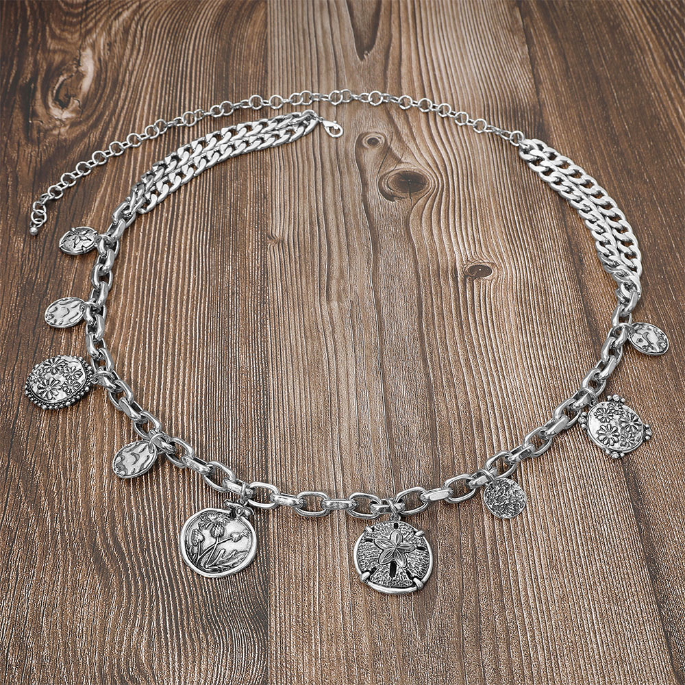 Details • Size : 2" H, 31" + 13" L • Stylish chunky chain belt adorned with embossed coin charms for a statement look. Adjustable length with secure clasp closure, perfect for accentuating the waist over dresses, tunics, or skirts. A bold and fashionable accessory that adds elegance and character to any outfit. • Lead and Nickel Compliant