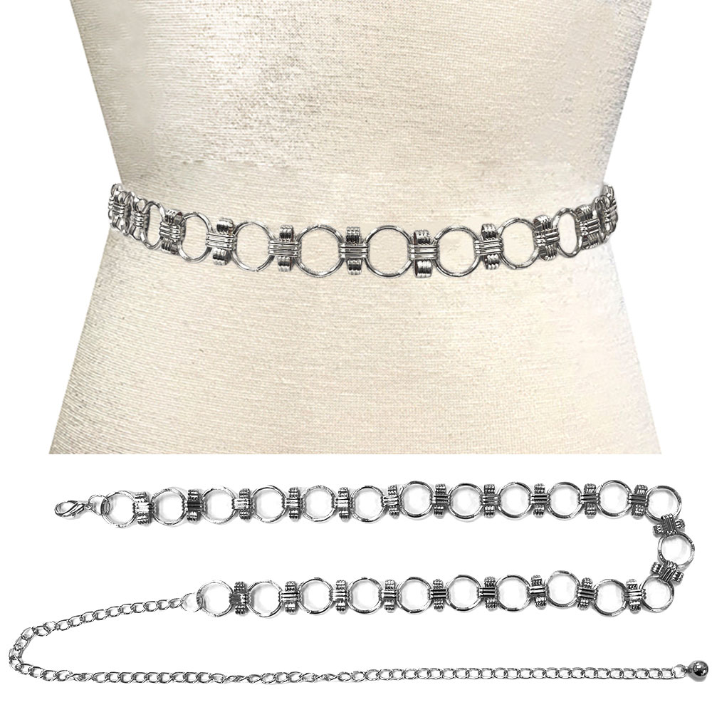 Details • Size : 1.2" H, 14" + 32" L • Elevate your look with this geometric link waist belt featuring a bold pattern of interlocking shapes. Designed for a sleek, sophisticated finish, it adds a touch of modern luxury to any outfit, making it the perfect accessory for chic and confident styling. • Lead and Nickel Compliant