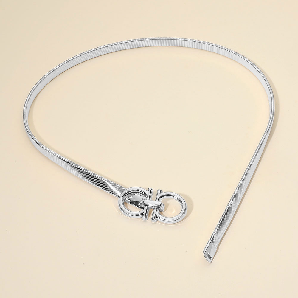 Details • Size : 1" H, appx 27" L • Stretchable • Hook Closure • Refine your look with this slim waist belt featuring a sleek double loop buckle. Perfect for pairing with dresses, skirts, or trousers, it adds a modern and polished touch while enhancing your silhouette. A versatile accessory that transitions effortlessly from casual outfits to formal occasions. • Lead and Nickel Compliant