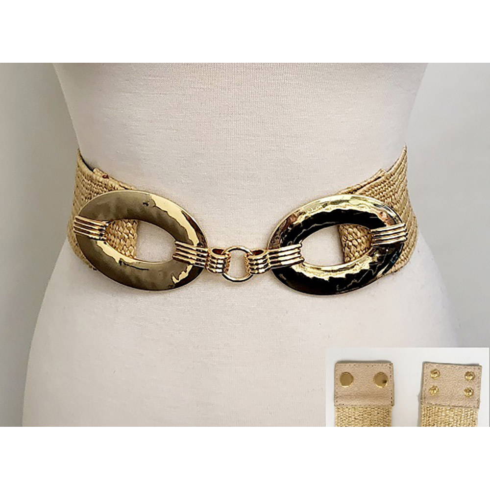 • Make a bold fashion statement with this wide stretch waist belt featuring an eye-catching oval buckle. Perfect for accentuating your waist and adding flair to dresses, tunics, or jumpsuits. Comfortable elastic design with secure snap closure for all-day wear.