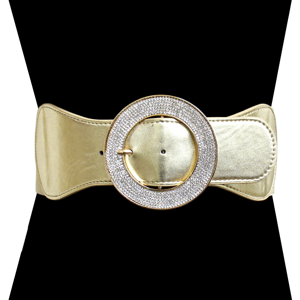 • Define your waistline with this elegant wide belt featuring a dazzling round crystal-studded buckle. Perfect for adding glamour and structure to dresses or layered outfits, this versatile accessory enhances your look with a chic and sophisticated finish.