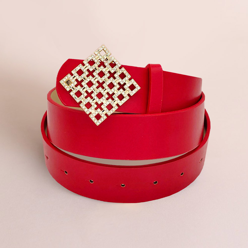 Rhinestone Embellished Square Cluster Buckle Faux Leather Belt
