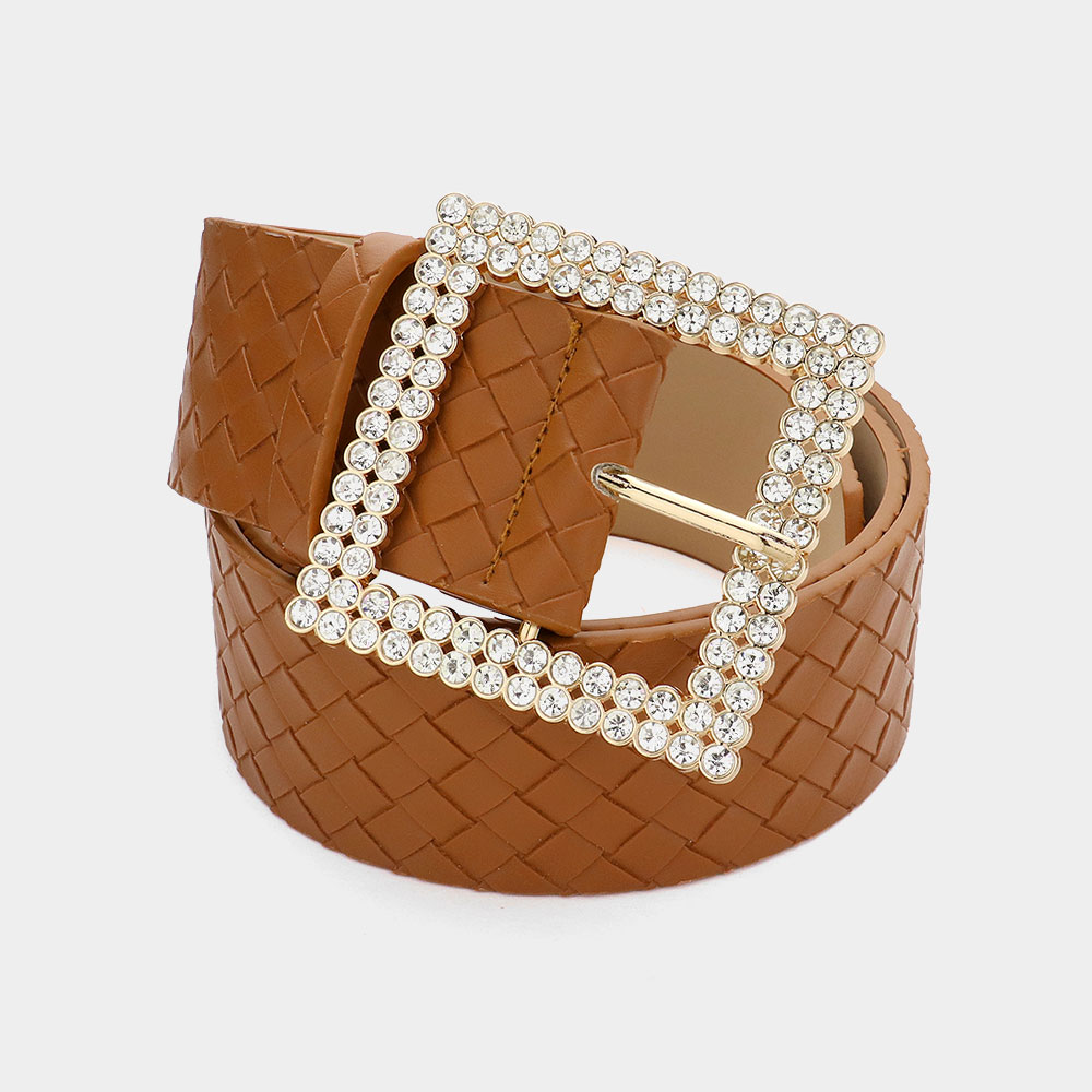 Round Rhinestone Embellished Square Buckle Braided Faux Leather Belt