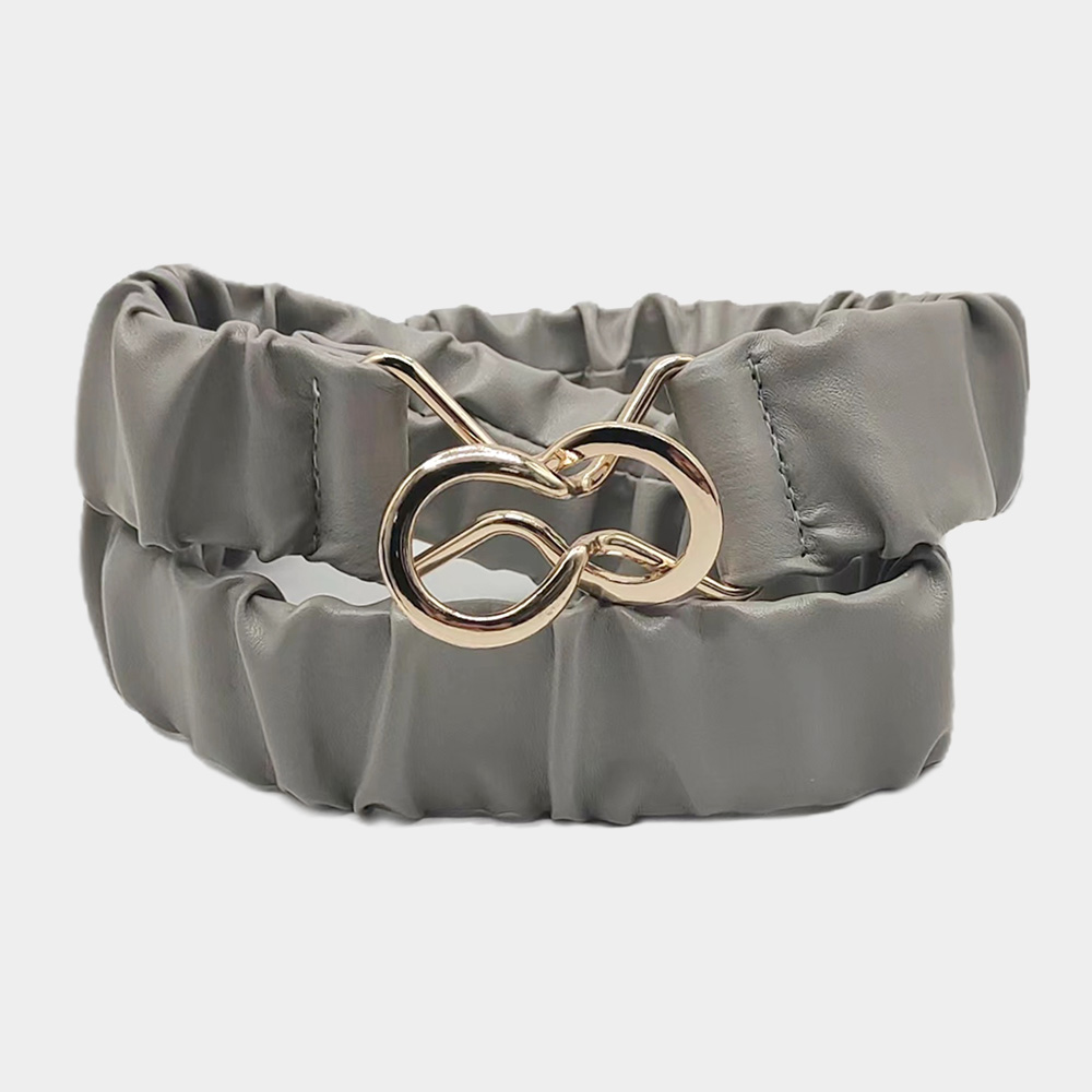 Details • Size : 1.25" H • Stretchable • Elevate your waistline with this stylish ruched stretch belt, featuring a soft faux leather finish and a sleek metallic clasp. A perfect accessory to cinch dresses or blouses with modern flair and comfort.