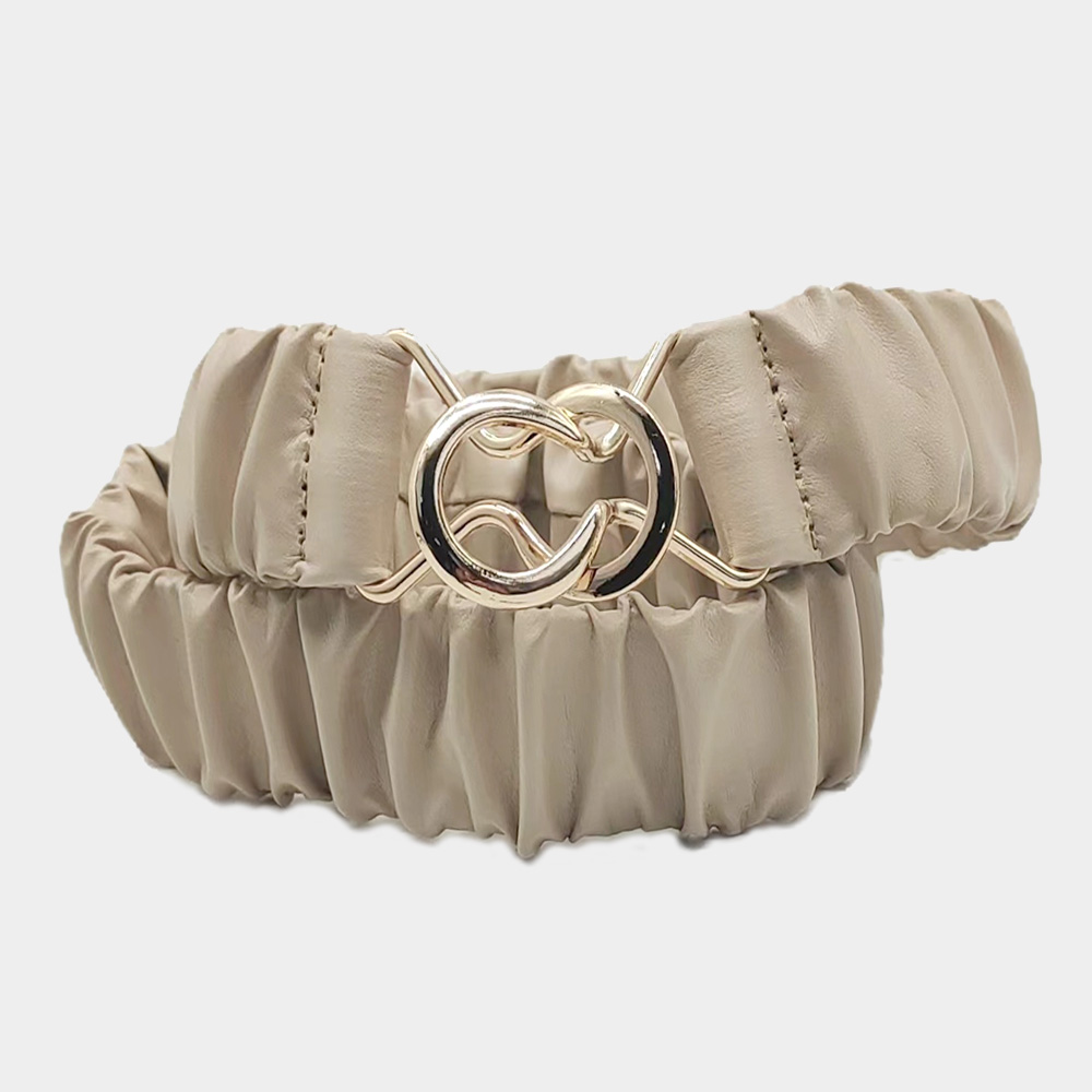 • Elevate your waistline with this stylish ruched stretch belt, featuring a soft faux leather finish and a sleek metallic clasp. A perfect accessory to cinch dresses or blouses with modern flair and comfort.