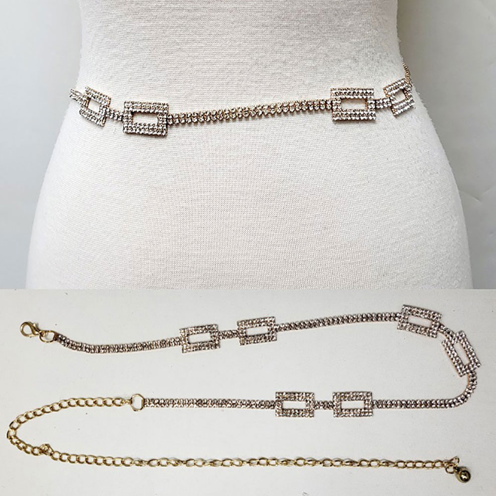 Stone Paved Double Rectangle Link Pointed Rhinestone Chain Waist Belt