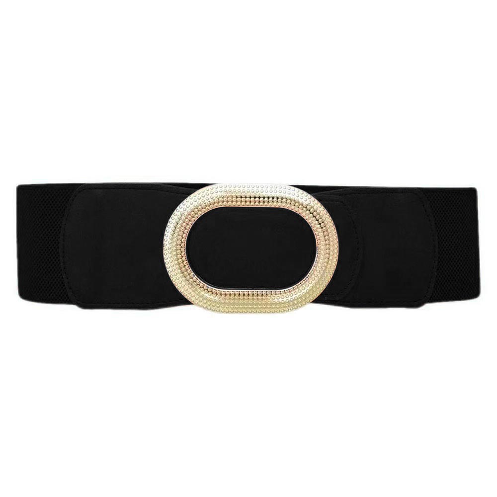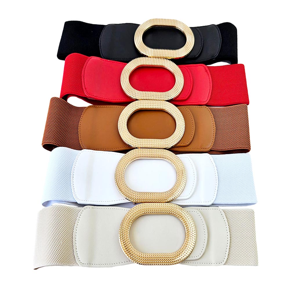 Textured Metal Oval Buckle Accent Wide Elastic Waist Belt