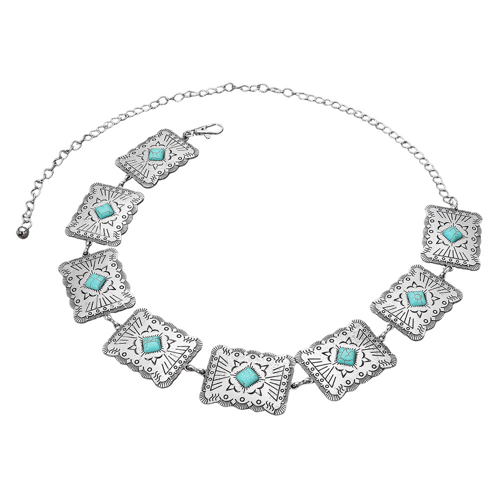 Details • Size : 1.25" H, 22" + 20" L • Add bold western flair with this square concho necklace featuring engraved details and turquoise accents. Adjustable for a perfect fit, this statement piece enhances casual and festival outfits, offering a rustic yet stylish touch to your jewelry collection. • Lead and Nickel Compliant