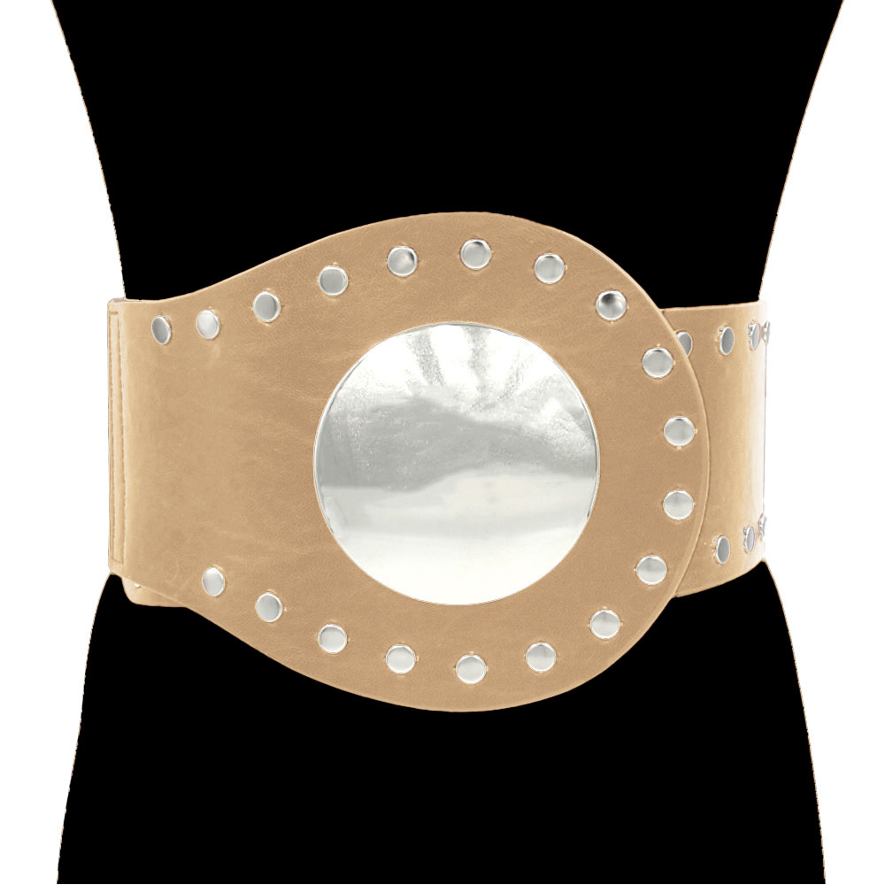 Details • Size : 5" H X 42" L (appx) • Adjustable 34" L - 38" L • This studded wide statement waist belt features a bold circular buckle with metallic accents that command attention. Designed to accentuate the waist with a contemporary edge, it adds a confident, high-fashion finish to dresses or tunics. Perfect for a chic and standout look. • Lead and Nickel Compliant