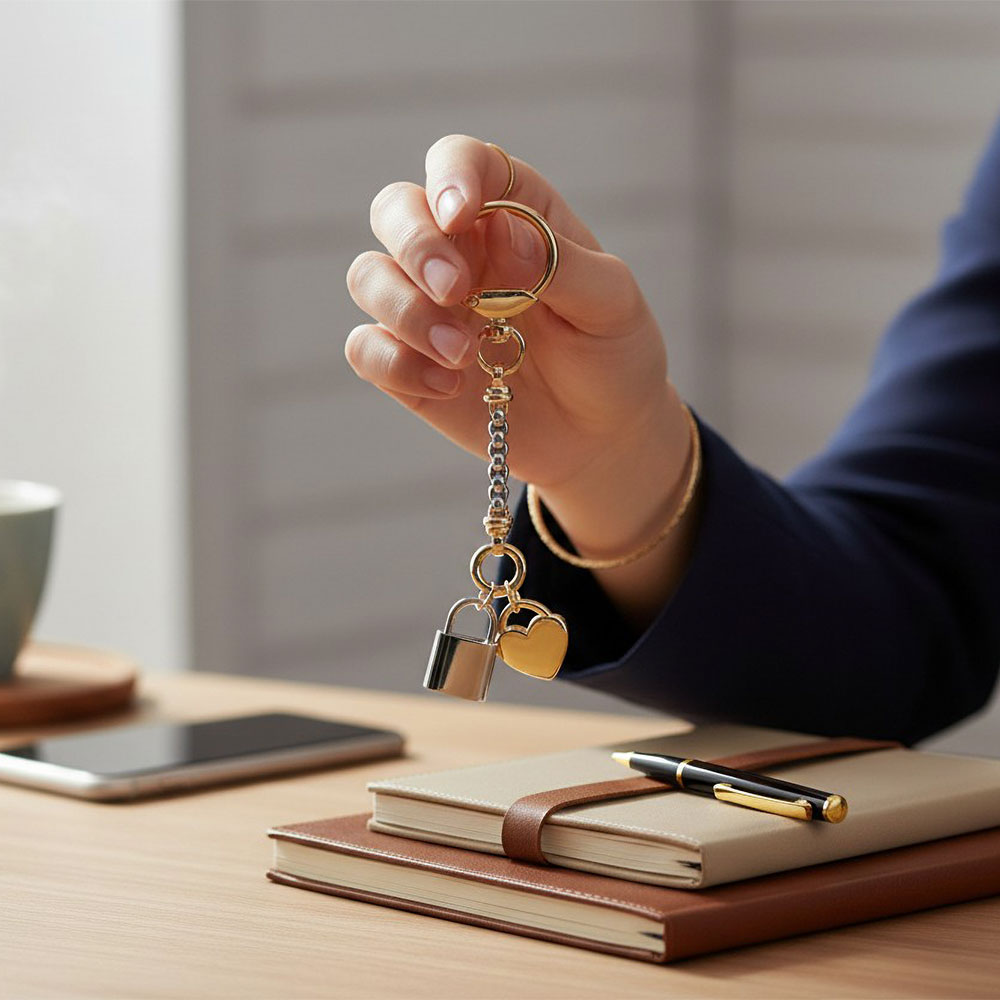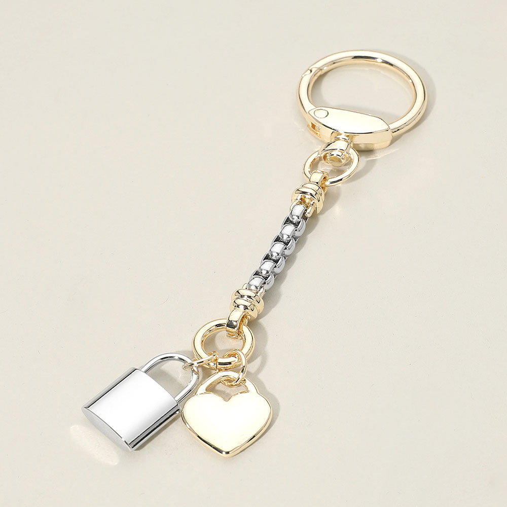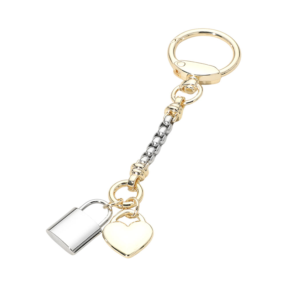Details • Size : 4.75" L, 0.75" X 3" • Stylish heart-and-padlock charm keychain featuring linked accents and a secure swivel clasp for easy attachment to keys, bags, or accessories. Designed to add a playful yet polished touch to daily essentials while staying lightweight, versatile, and ideal for gifting or personal flair. • Gold Dipped