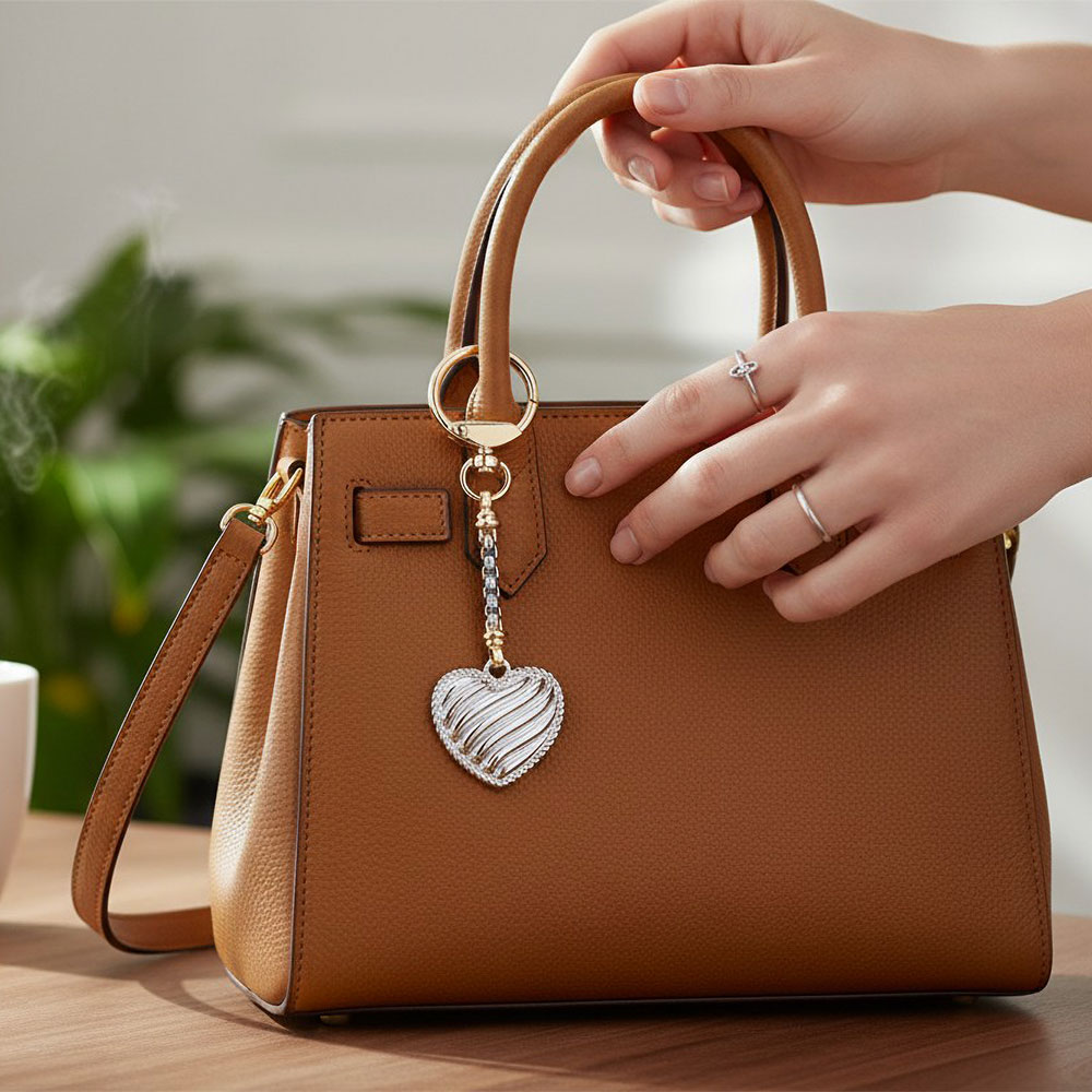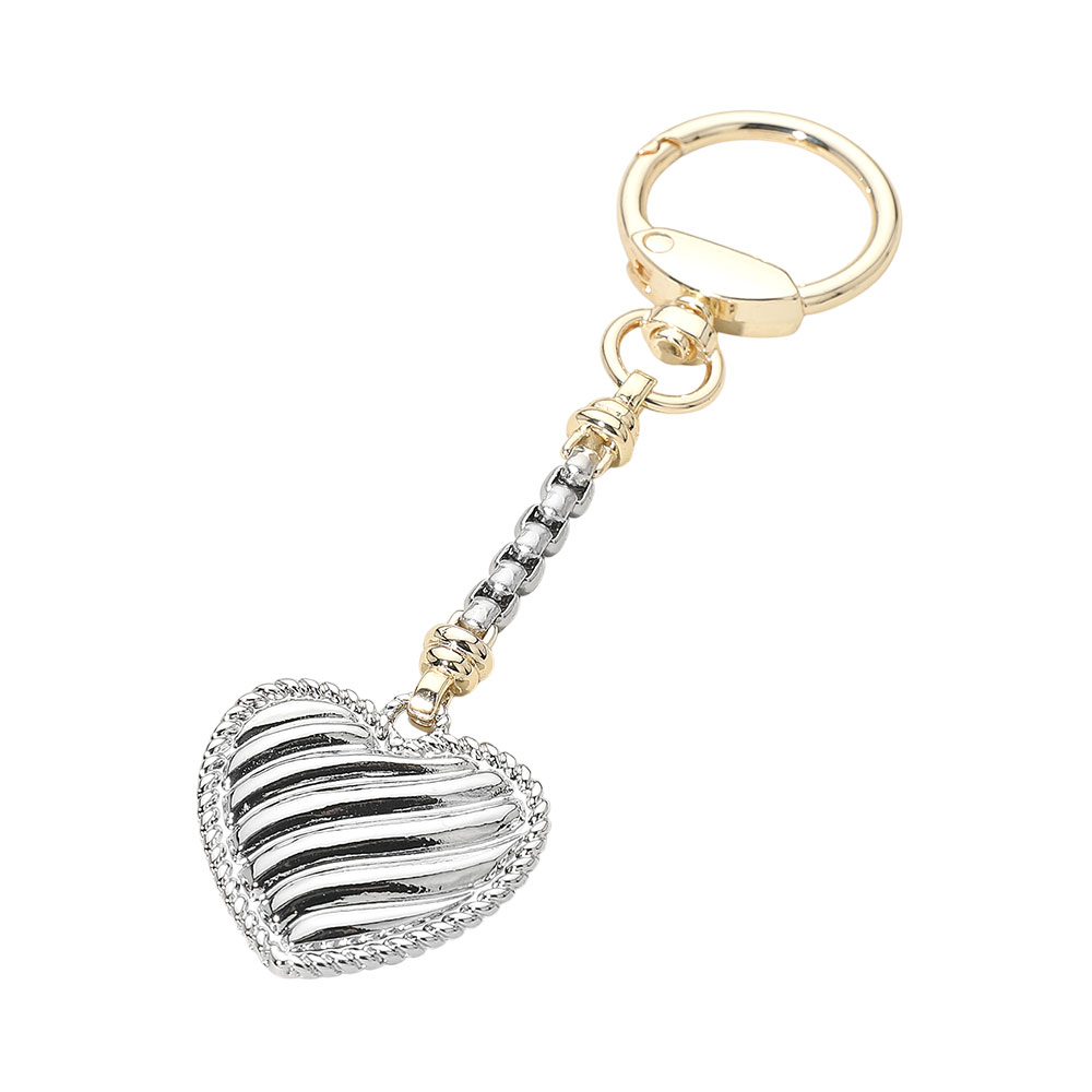 Details • Size : 4.75" L, 1.3" X 3.5" • Stylish two tone heart charm keychain with a sleek textured pendant and secure clasp, designed to add a refined accent to handbags, backpacks, or keys. A versatile everyday accessory and thoughtful gift choice, offering decorative appeal with easy attachment and lasting style. • Gold Dipped