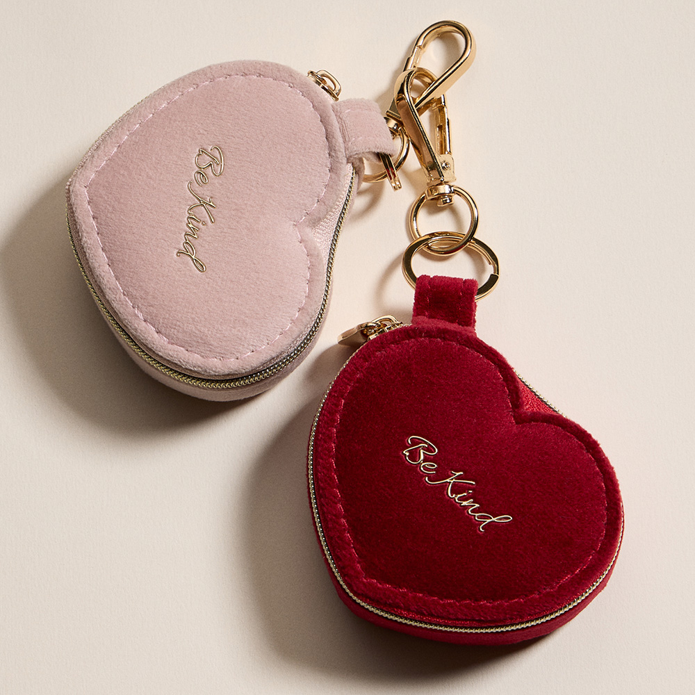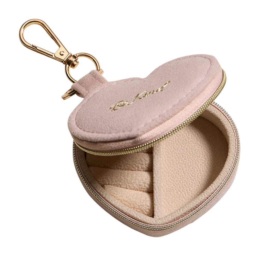 Details • Size : 3" X 2" X 1.25" • Zipper closure for secure storage • Polished gold-tone keyring with clasp hardware • Compact storage for rings, earrings & small jewelry • Ideal for travel, everyday use, or thoughtful gifts • Heart shaped travel jewelry case keychain featuring a zipper closure, soft interior with ring slots and compartment for small accessories. Compact and portable design makes it ideal for keeping jewelry secure at home or on the go, while the keychain clip adds convenience and style for daily use.