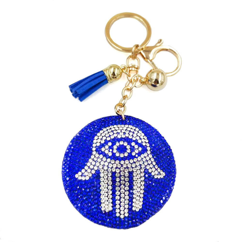 Details • Size : 2.5" X 2.5", 5" L • Stylish Hamsa hand keychain adorned with sparkling rhinestones and tassel charm. A meaningful accessory symbolizing protection and positivity, perfect for keys, handbags, or as a thoughtful gift. • Lead and Nickel Compliant