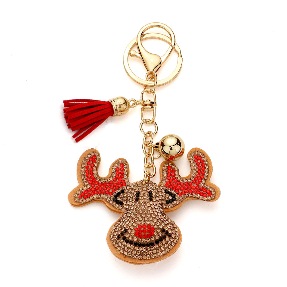 Details • Size : 3" X 2.4", 5.25" L • Bring holiday cheer wherever you go with this reindeer rhinestone keychain, featuring sparkling crystal accents, a playful tassel, and a jingle bell for extra charm. Perfect for gifting or adding festive flair to your keys or bags. • Lead and Nickel Compliant