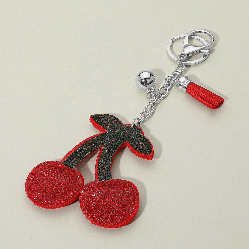 • Playful keychain featuring a sparkling cherry design embellished with crystals. Accented with a tassel and charm, this accessory adds a fun, stylish touch to bags or keys while showcasing a whimsical fruit-inspired motif.