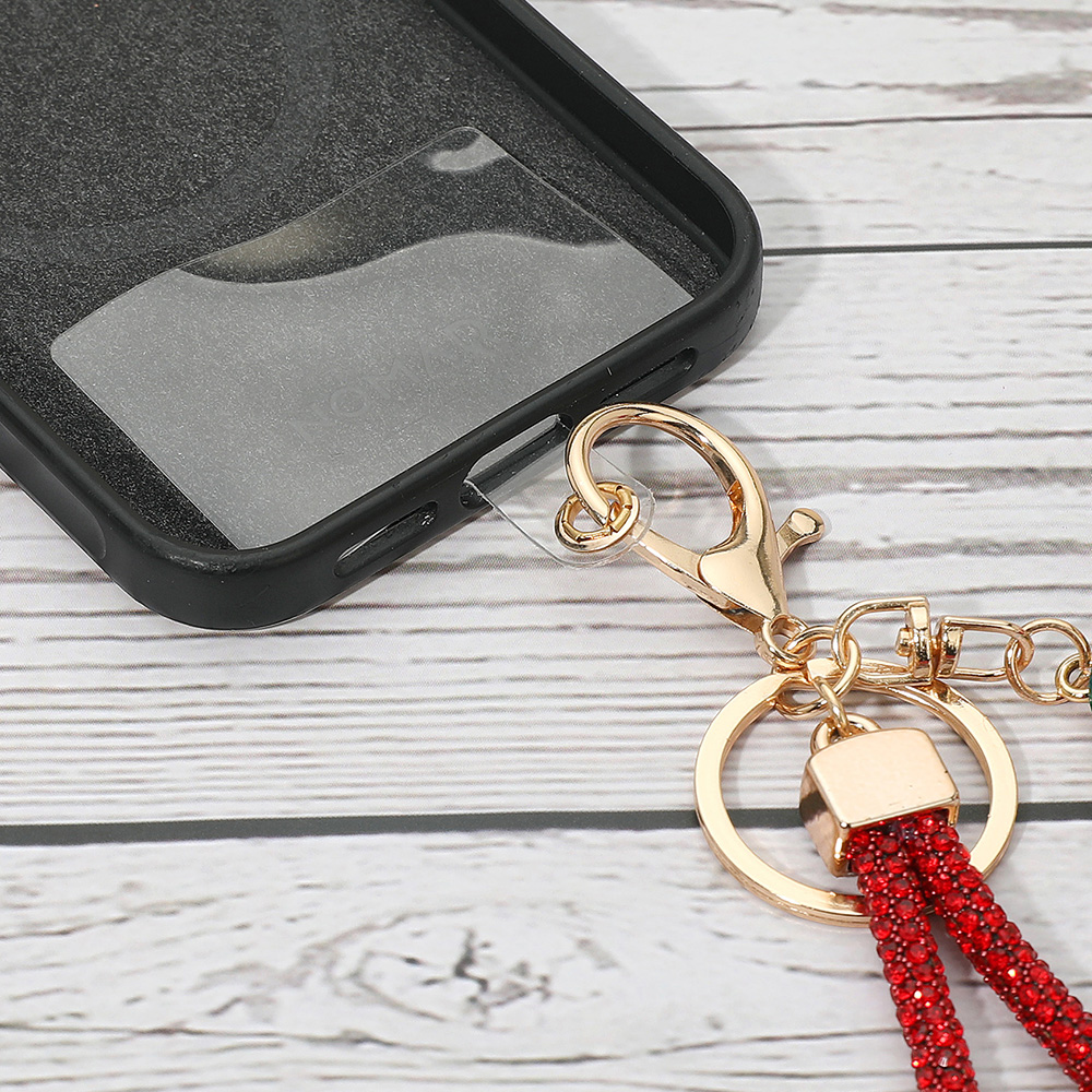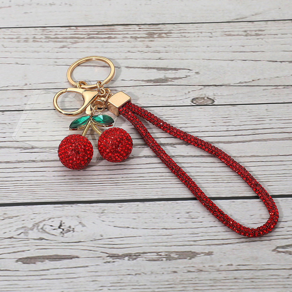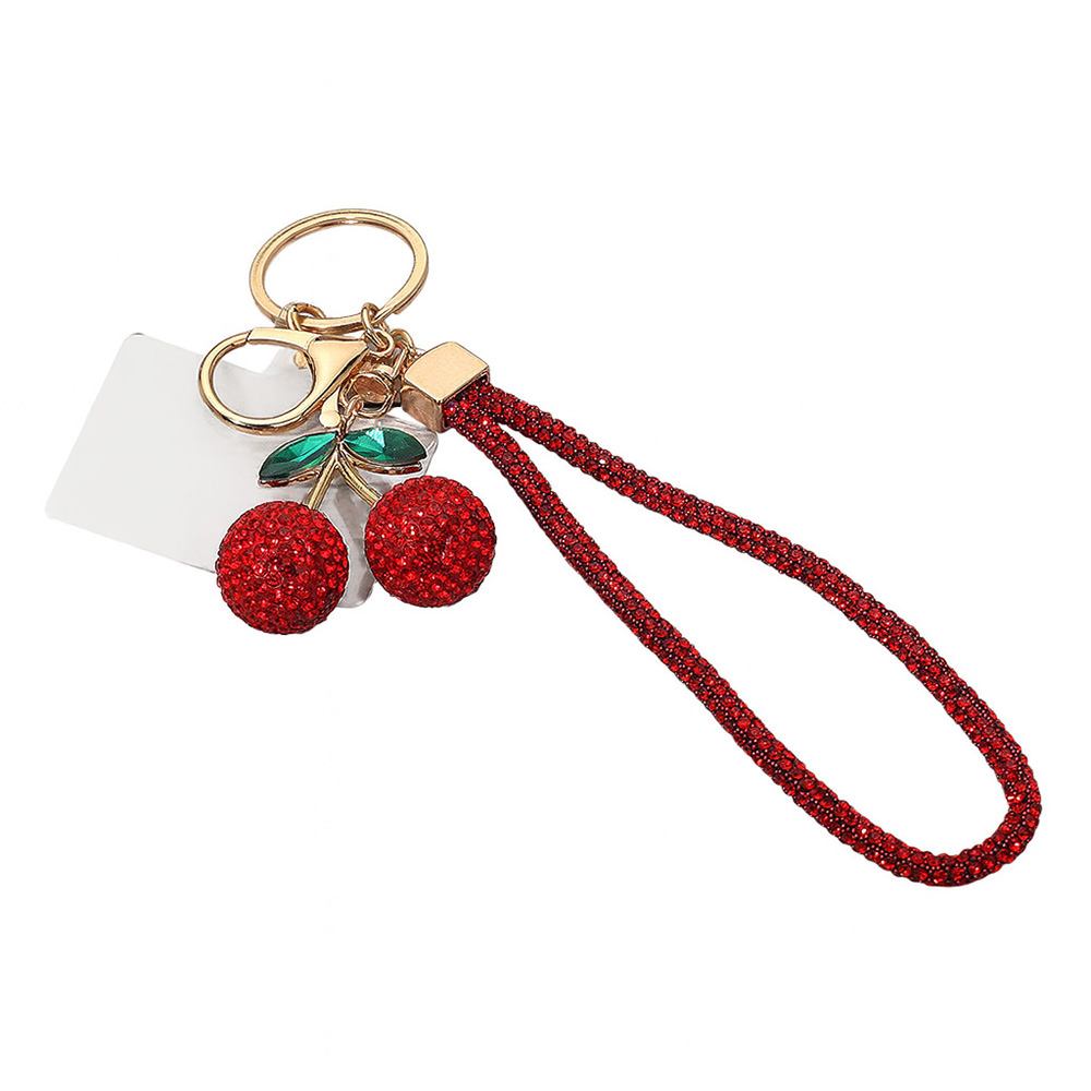 • Cute cherry keychain adorned with shimmering rhinestones and a matching strap. A fun and stylish accessory to add charm to your keys, bags, or everyday essentials while keeping them secure and easy to carry.
