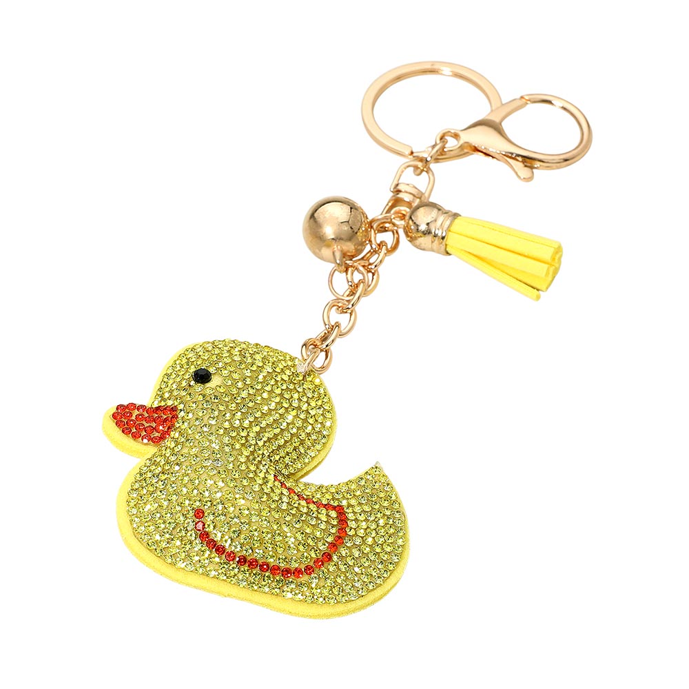 • Cute duck-shaped keychain covered in sparkling rhinestones with a tassel charm for added flair. A fun and playful accessory to personalize your keys, handbag, or backpack. Makes a charming and cheerful gift for anyone who loves unique and glittery keychains.