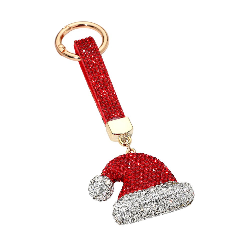 Details • Size : 1.8" X 1.5", 5.4" L • Sparkling Santa hat keychain covered in dazzling rhinestones and paired with a matching strap. A festive and stylish accessory perfect for holiday season flair. Attach it to keys, handbags, or gift bags for a cheerful touch or use it as a cute stocking stuffer idea. • Lead and Nickel Compliant