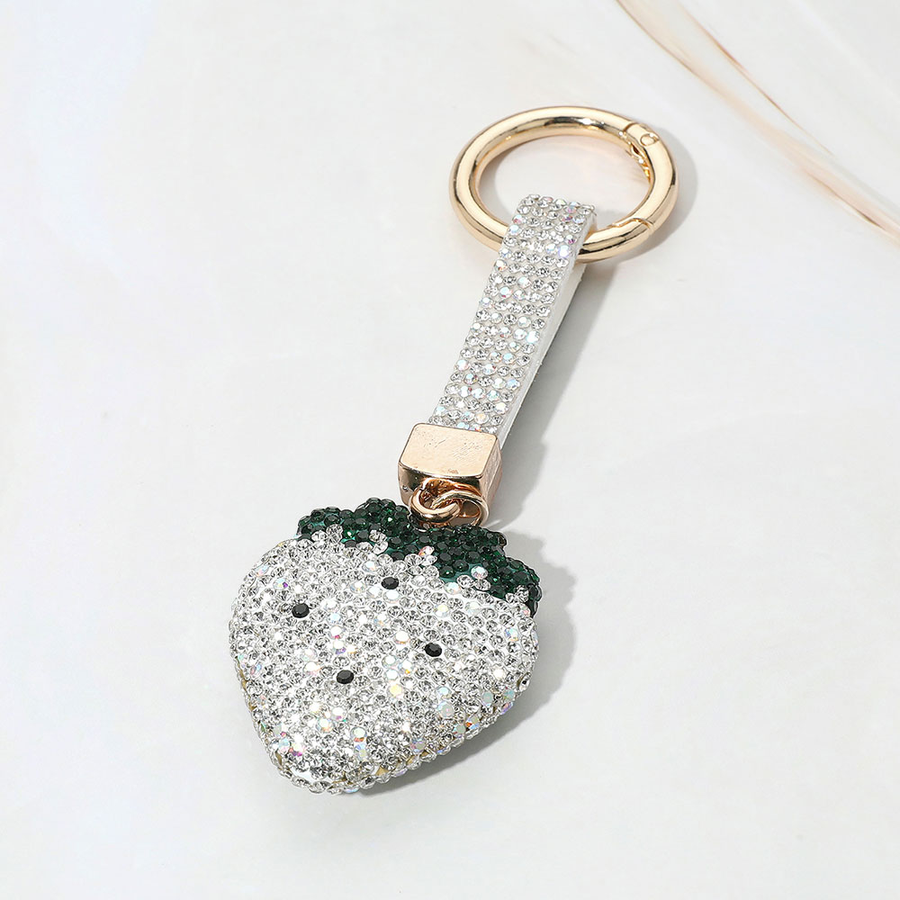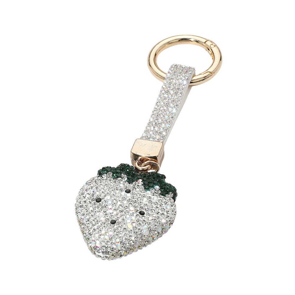 • Chic strawberry-shaped keychain embellished with sparkling rhinestones and a loop strap. A playful and stylish accessory to personalize your keys or bags. Ideal for gifting or everyday flair.