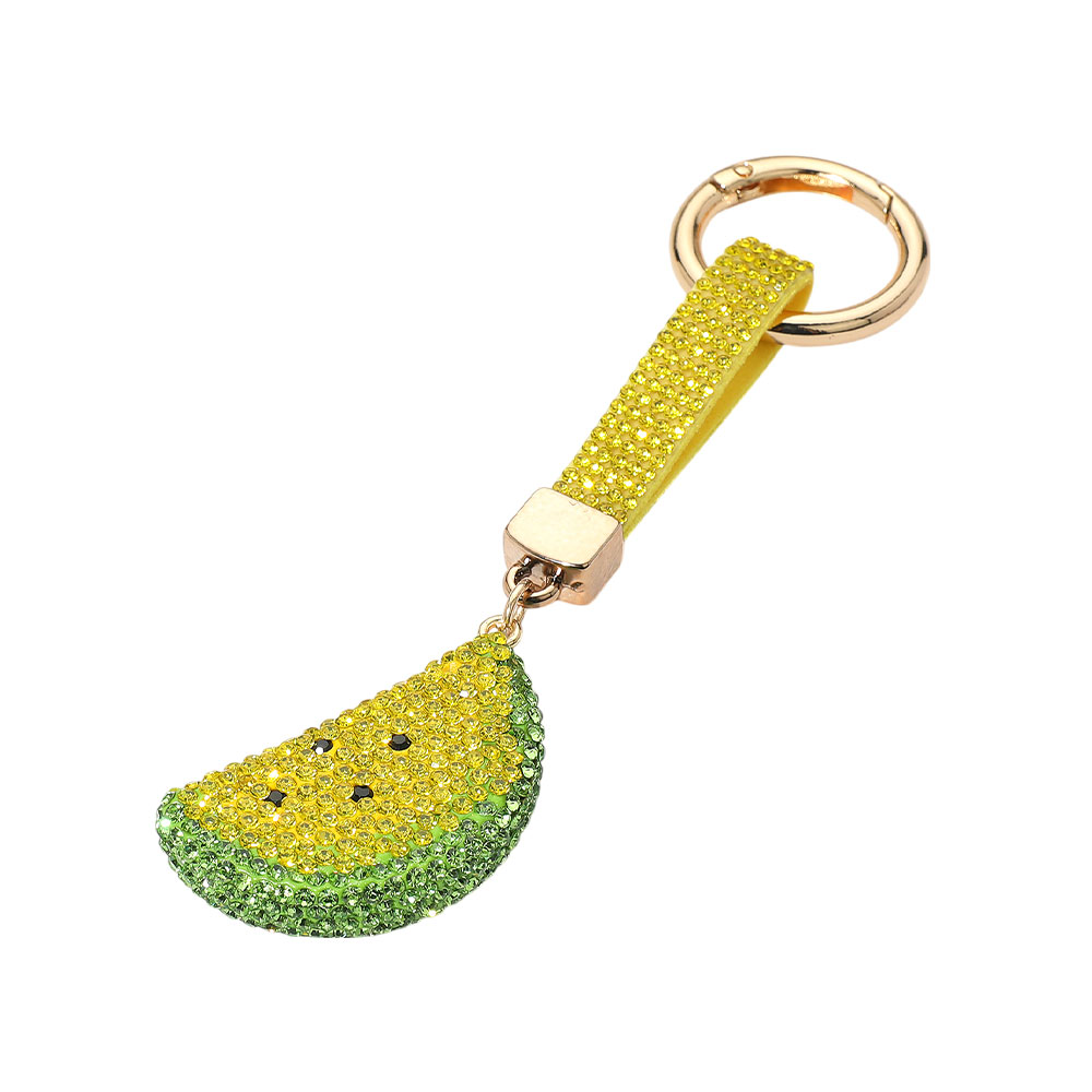 • Add a juicy touch to your style with this rhinestone watermelon keychain. Shaped like a fruit slice, it's ideal for decorating bags or keys. Sparkling and playful, it makes a fun and eye-catching gift.