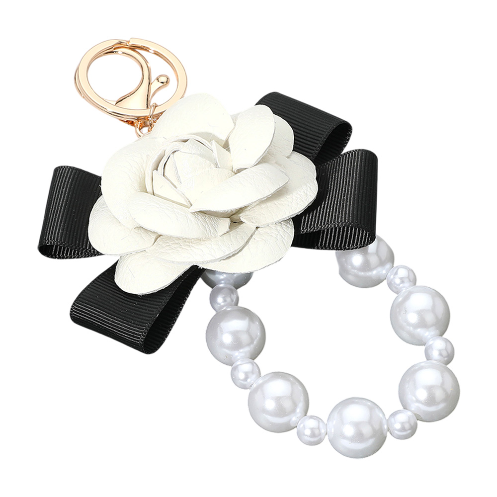 • Chic keychain featuring a textured floral charm atop a satin bow, paired with a pearl bead loop. A stylish accessory perfect for adding elegance to your keys, purse, or backpack.