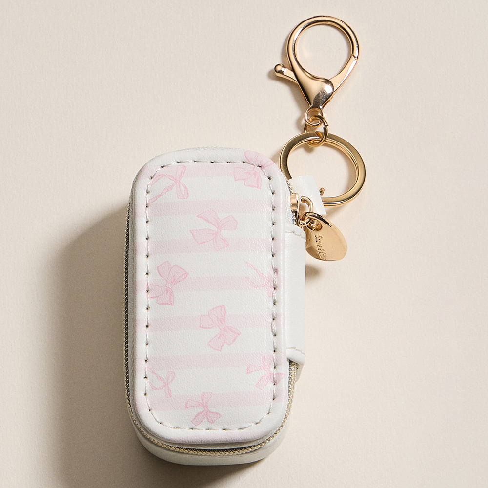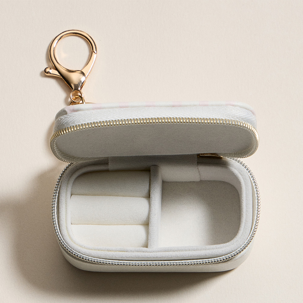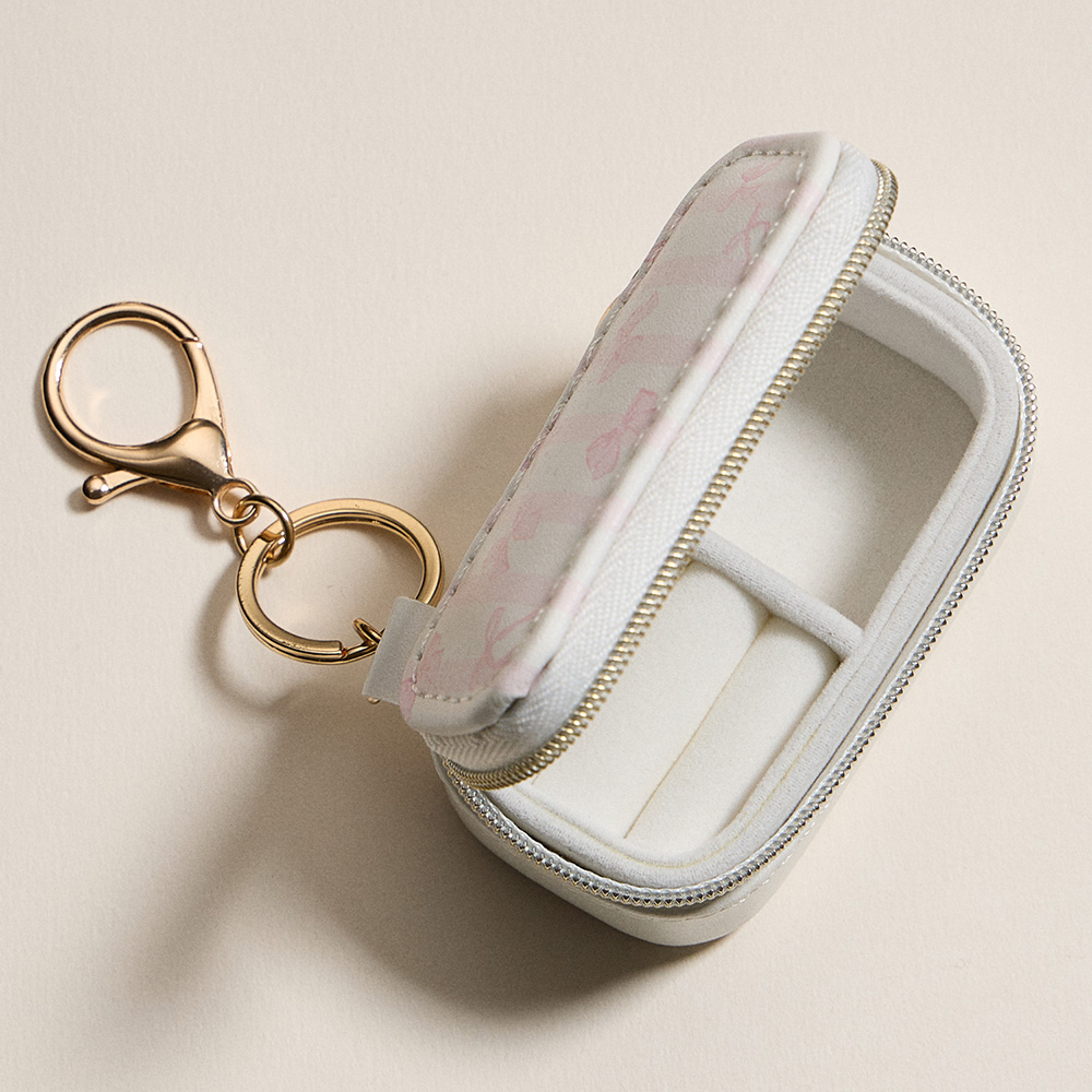 Details • Size : 3" X 1.5" X 1.5" • Zipper closure for secure storage • Polished gold-tone keyring with clasp hardware • Compact storage for rings, earrings & small jewelry • Ideal for travel, everyday use, or thoughtful gifts • Compact rectangular travel jewelry case featuring a soft interior with ring slots and sectioned storage. Designed with a delicate bow pattern, zipper closure, and attached keychain clasp, this portable organizer is perfect for keeping earrings, rings, and small accessories secure anywhere.