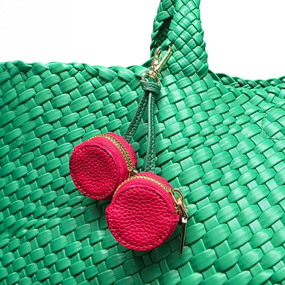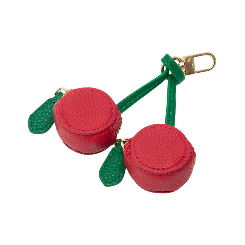 Details • Size : 5.5" L, 3.75" X 4.25" • Zipper Closure • Perfect For Airpods • Cute cherry-shaped keychain pouch featuring dual mini zip compartments, faux leather texture, and a secure clasp—perfect for holding small essentials with playful charm.