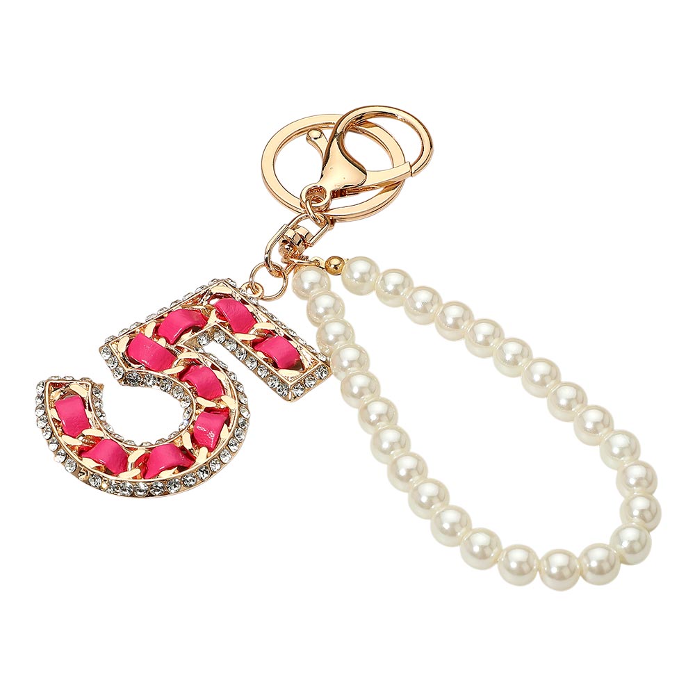 Faux Leather Threaded Number Five Pearl Beaded Keychain / Bag Charm