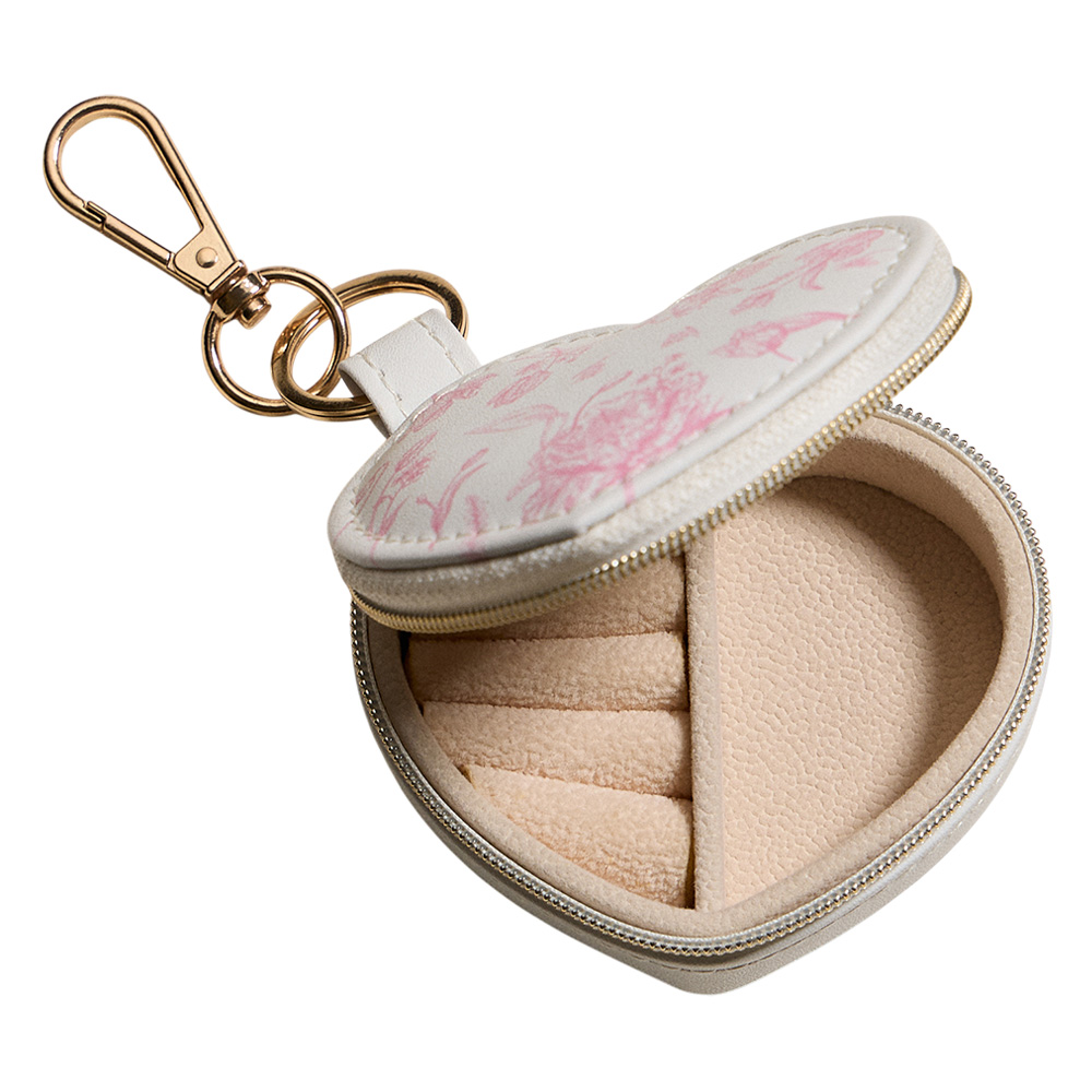 Details • Size : 3" X 2" X 1.25" • Zipper closure for secure storage • Polished gold-tone keyring with clasp hardware • Compact storage for rings, earrings & small jewelry • Ideal for travel, everyday use, or thoughtful gifts • Keep your jewelry safe and organized with this heart-shaped travel case featuring a delicate floral print. Designed with ring slots and compartments, this portable organizer includes a secure zipper closure and keychain clip, perfect for storing rings, earrings, and small accessories anywhere.
