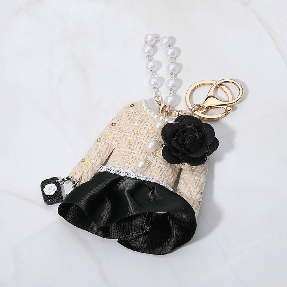 Details • Size : 5.5" L, 3.3" X 3.5" • Material : 100% Polyester • Add a touch of sophistication to your keys or handbag with this chic dress-shaped keychain. Designed with a pearl chain, floral embellishment, and stylish accents, it’s a fashionable accessory and thoughtful gift for birthdays, holidays, or everyday charm.