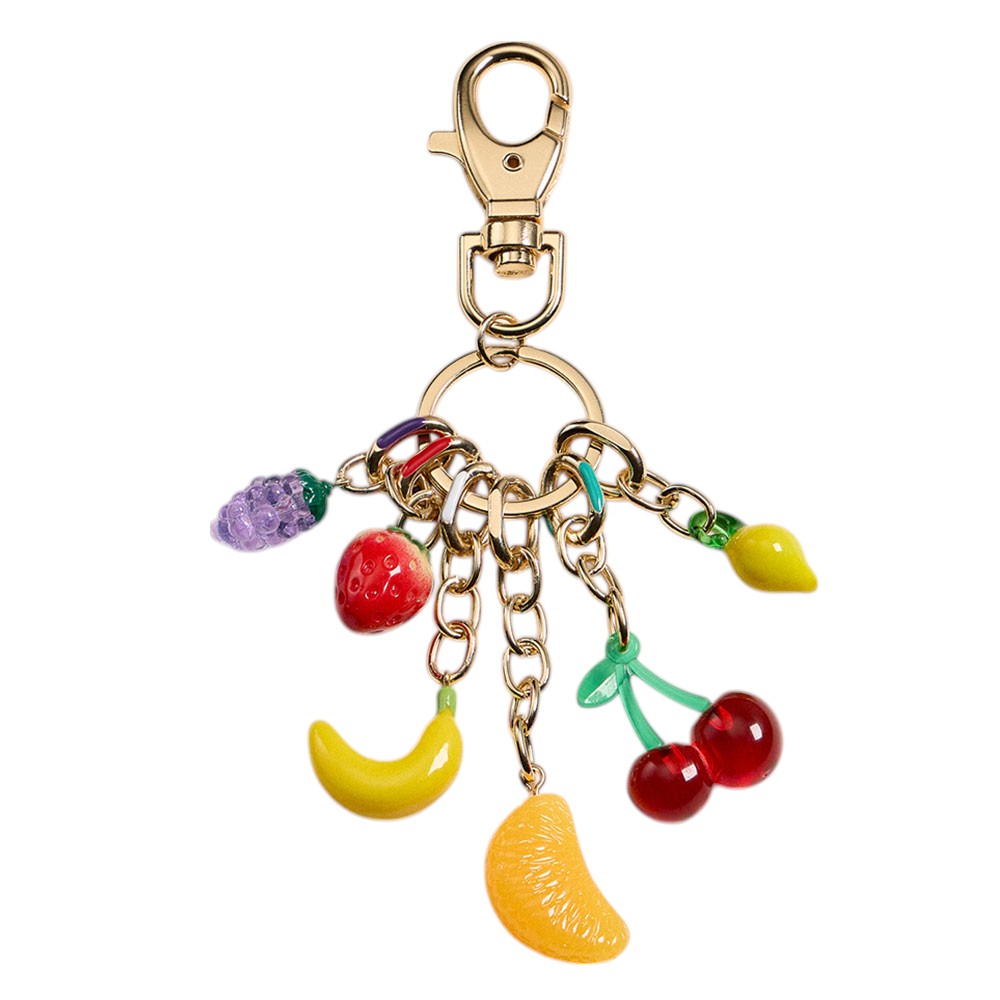 • Playful keychain featuring a variety of mini fruit charms on a gold-tone chain—perfect for adding a fun touch to keys, bags, or backpacks. Durable clasp for easy attachment.