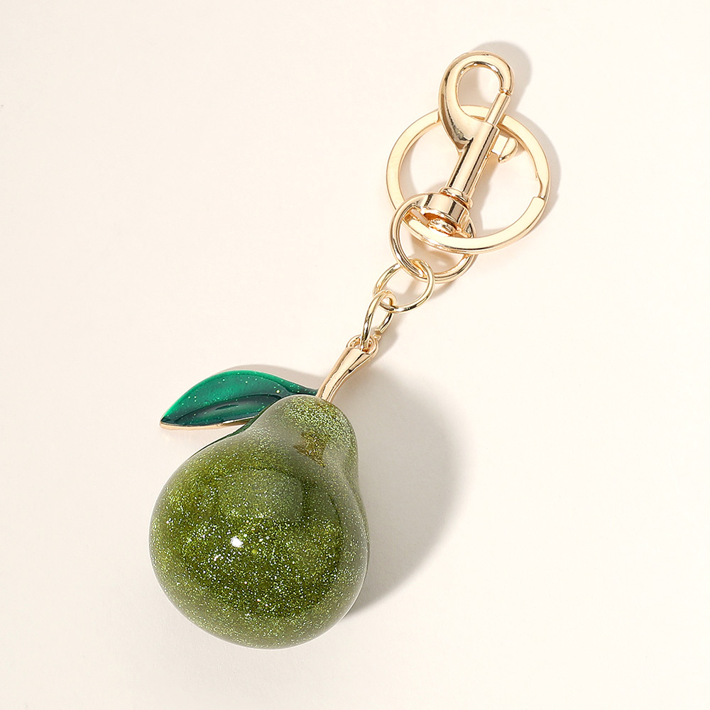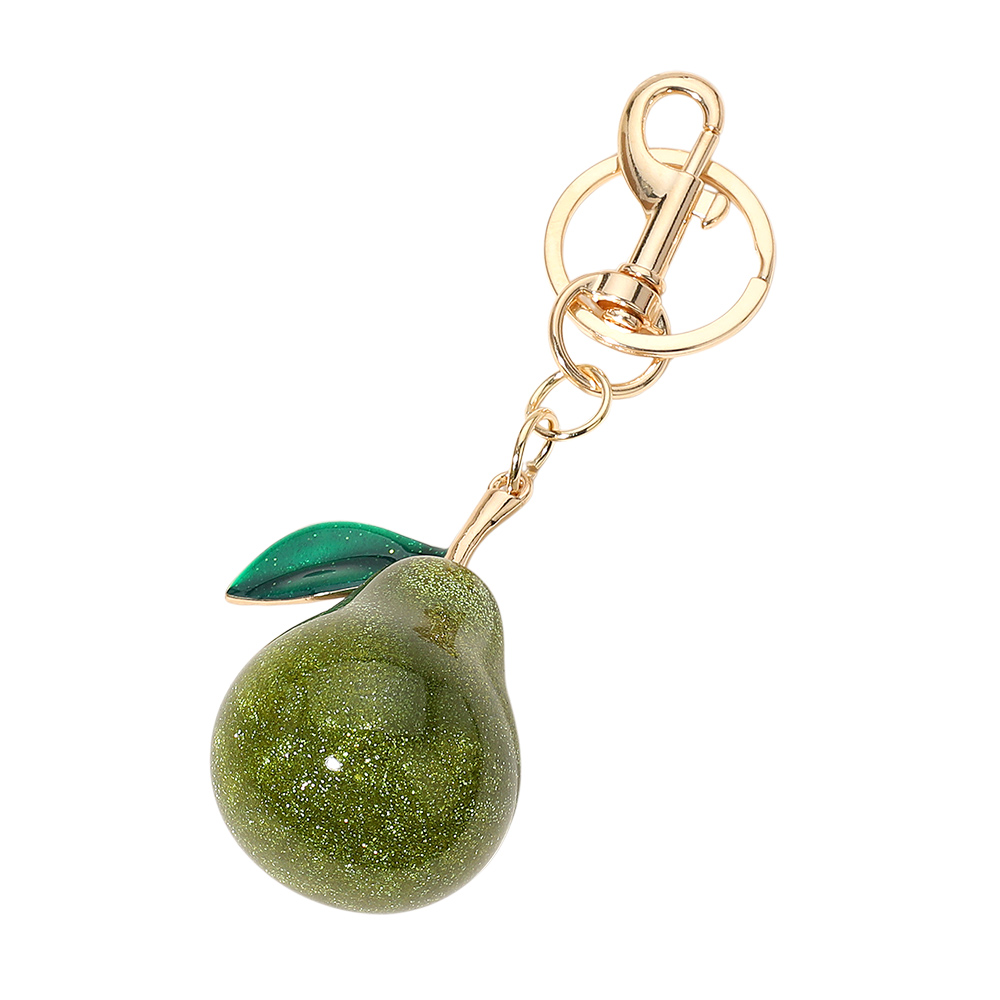 • Chic pear-shaped keychain featuring a glossy finish and metallic leaf accent. A fresh and fun accessory for keys, totes, or backpacks—perfect for fruit lovers and playful everyday style.
