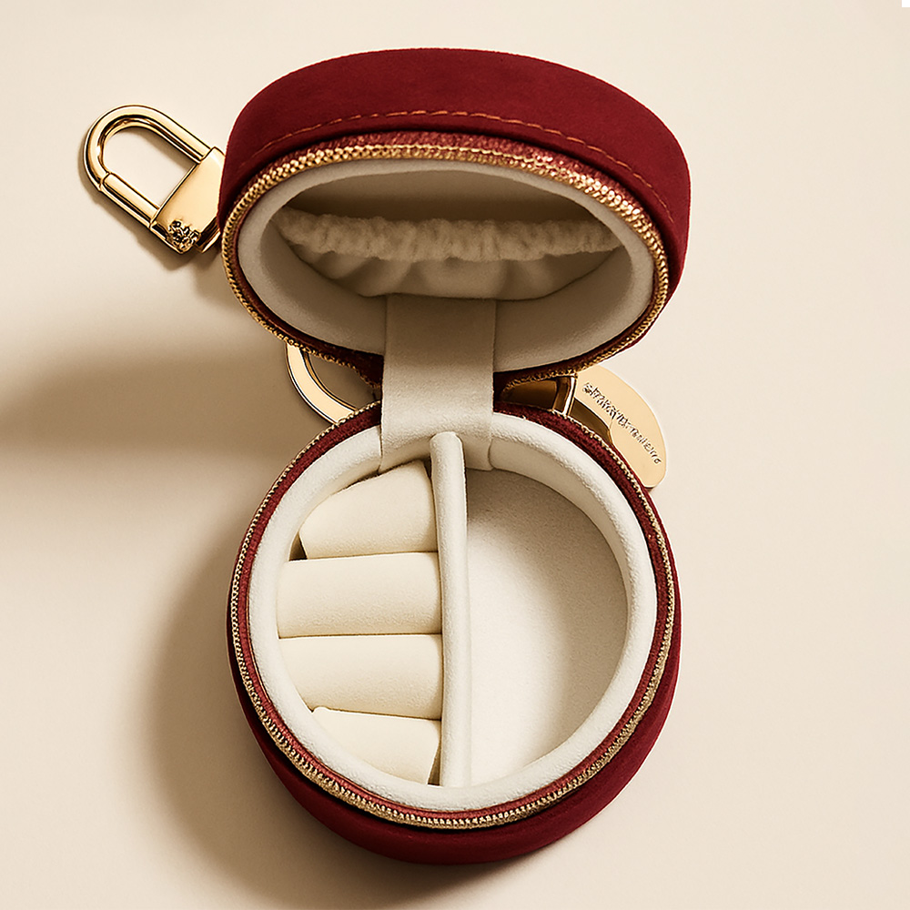 Details • Size : 2.25" X 1.5" • Zipper closure for secure storage • Polished gold-tone keyring with clasp hardware • Compact storage for rings, earrings & small jewelry • Ideal for travel, everyday use, or thoughtful gifts • Keep your jewelry safe and organized with this compact round travel case. Features a zipper closure, interior slots for rings and earrings, and a keychain clip for convenience. Perfect for travel, handbags, or daily use, this portable storage box ensures your accessories stay secure anywhere.