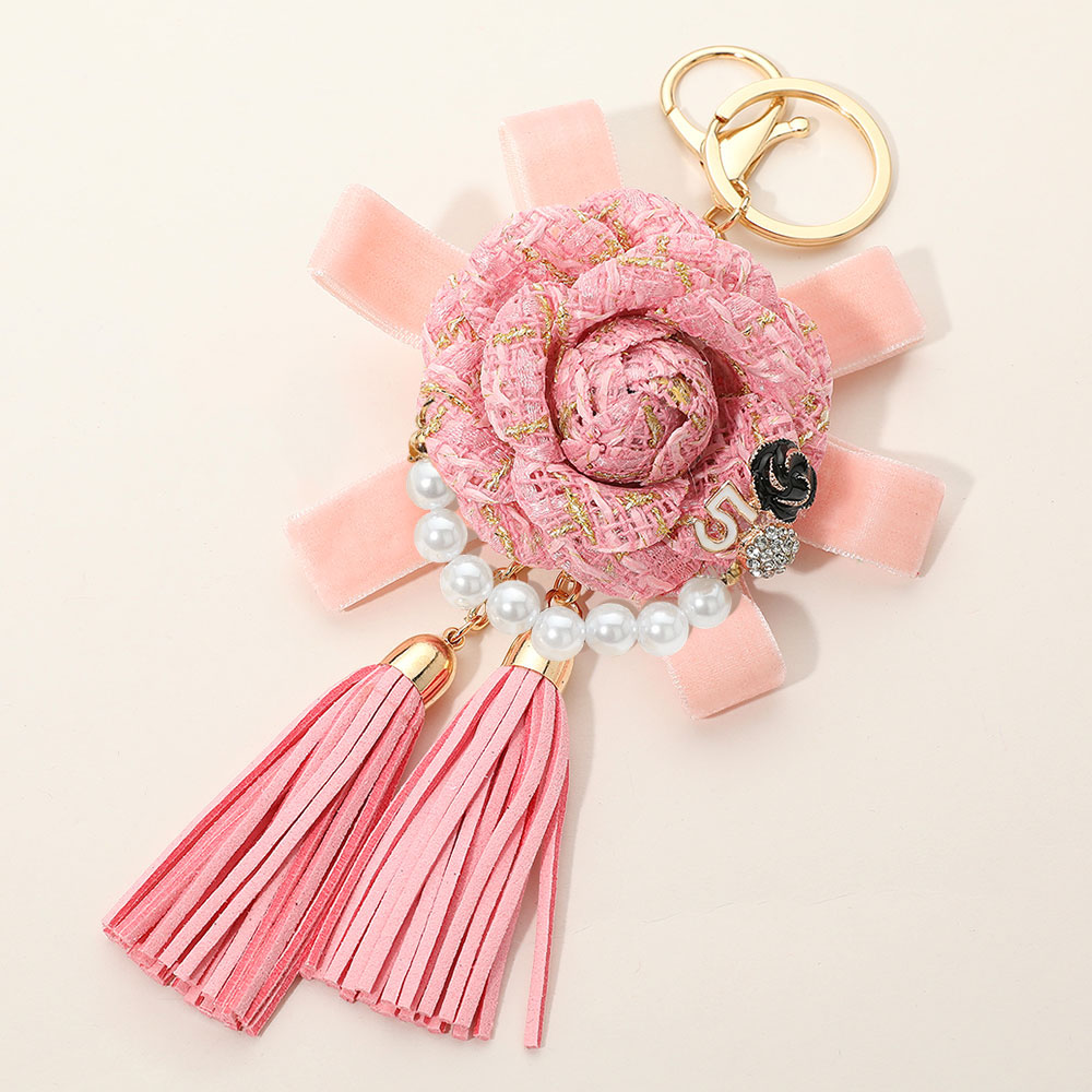 • Chic floral keychain featuring a rosette center, pearl strand, and twin tassels. A stylish accessory that adds a sophisticated flair to bags or keys, perfect for gifting or everyday use.