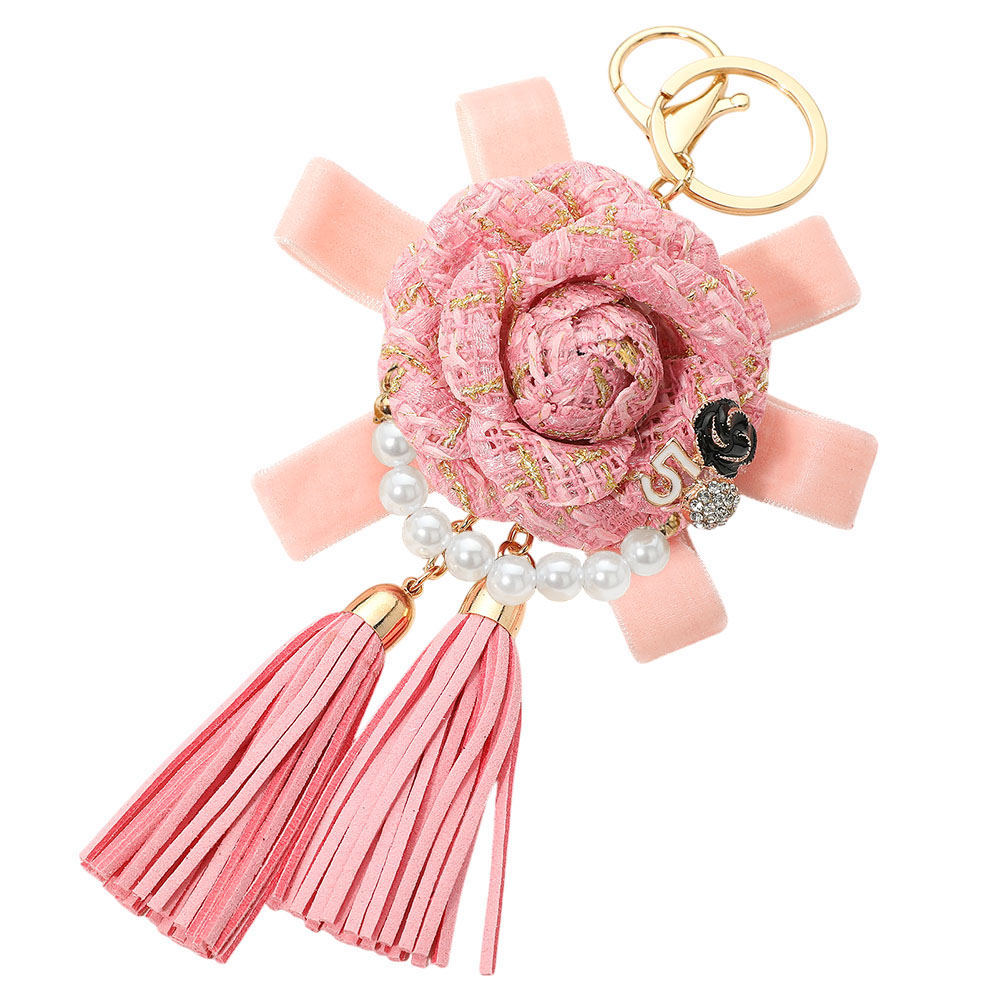 Number Five Pearl Accent Tweed Flower Bow Tassel Keychain / Bag Charm Number Five Pearl Accent Tweed Flower Bow Tassel Keychain / Bag Charm