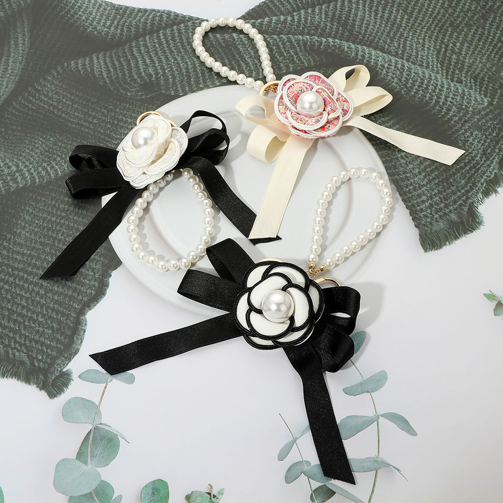 • Elegant keychain featuring a satin bow and layered floral centerpiece with a pearl detail, attached to a beaded loop. A stylish accessory perfect for adding elegance to your keys or bag.