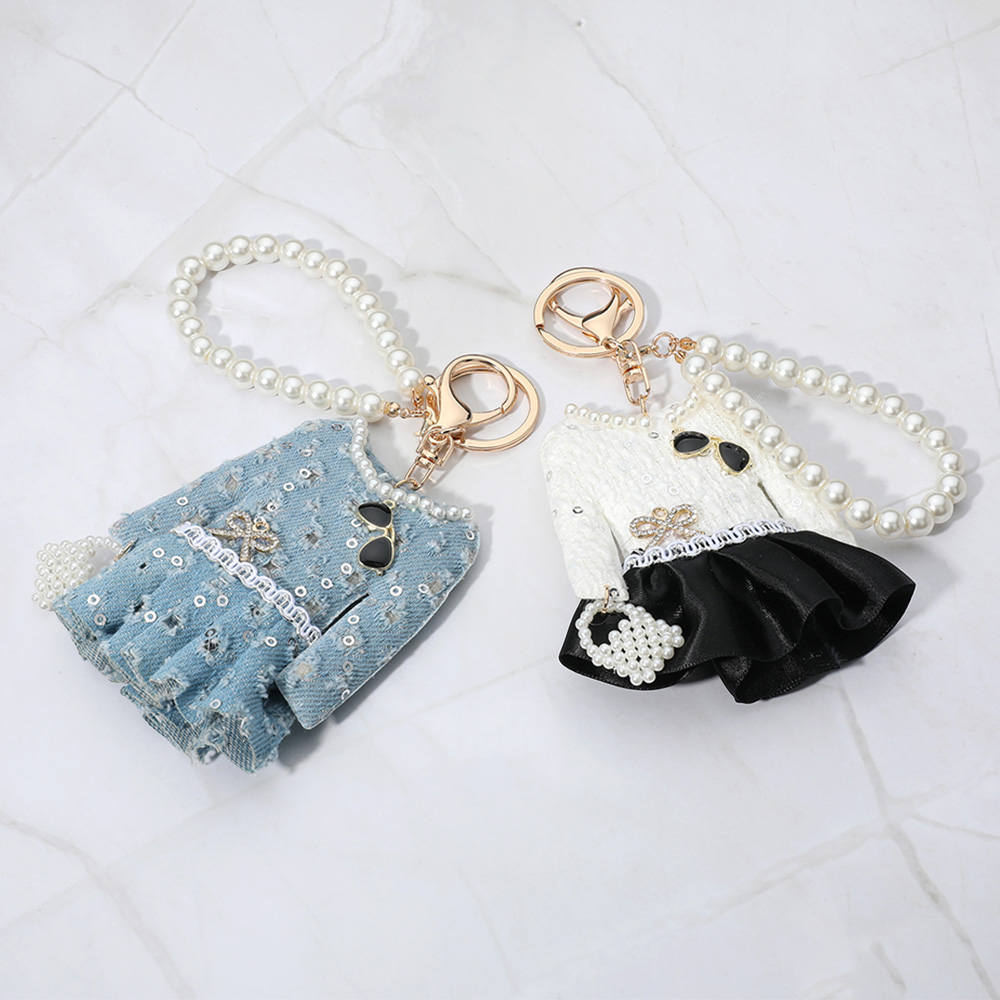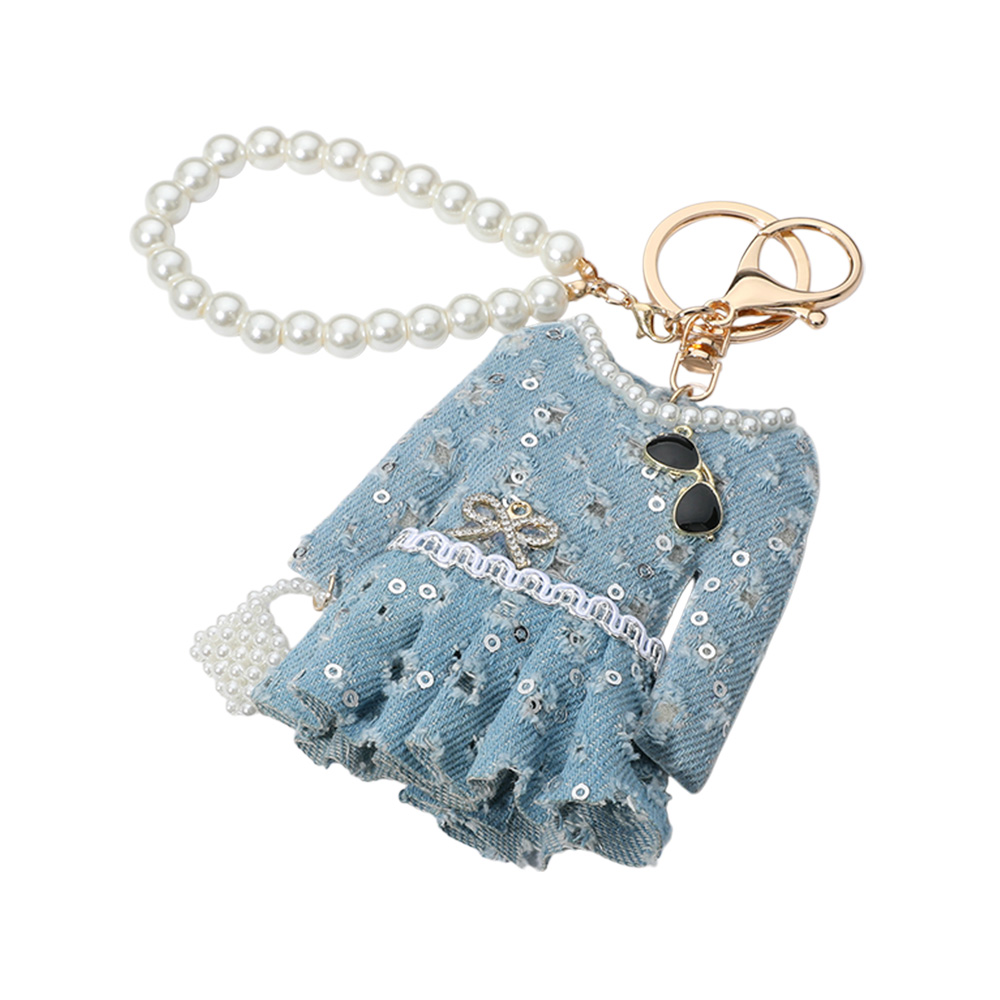 Details • Size : 5.5" L, 3.5" X 3.7" • Material : 100% Polyester • Carry charm and style wherever you go with this denim-inspired dress keychain. Featuring a pearl chain, bow detail, and mini sunglasses accent, it’s the perfect accessory for keys, handbags, or as a thoughtful gift for fashion lovers.