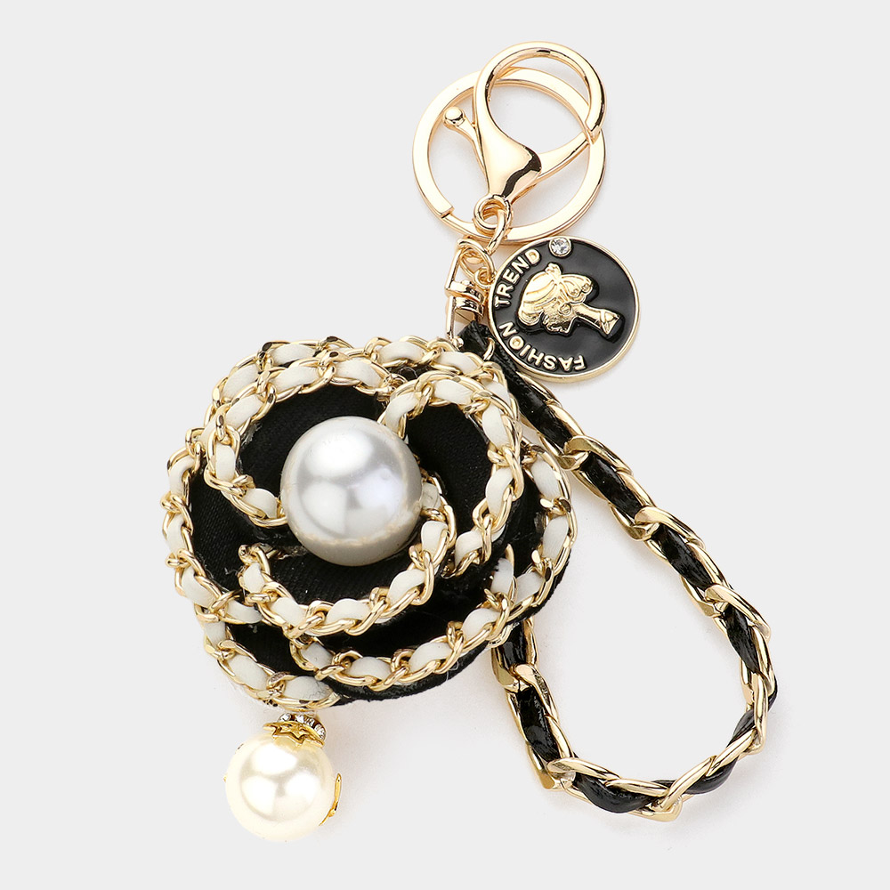 Pearl Pointed Faux Leather Braided Chain Deco Flower Keychain / Bag Charm