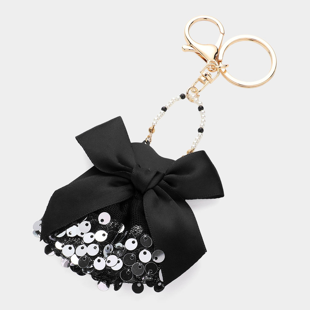 Details • Size : 6.5" L, 3" X 3.75" • Add a touch of chic style with this fashion jacket keychain featuring sparkling sequins, a stylish bow, and beaded handle detail. Perfect as a key holder or bag charm, this trendy accessory makes a fashionable statement while keeping your essentials organized. A unique gift for style lovers.