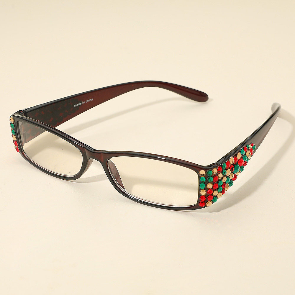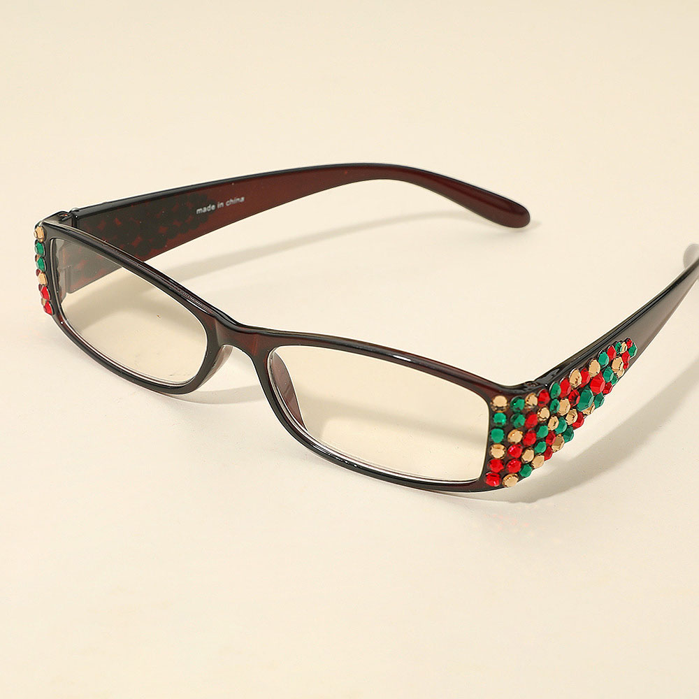 • Stylish reading glasses designed with sparkling embellishments along the frames. Offering both function and flair, they bring a touch of glamour to everyday eyewear while ensuring comfort and clarity for daily use.