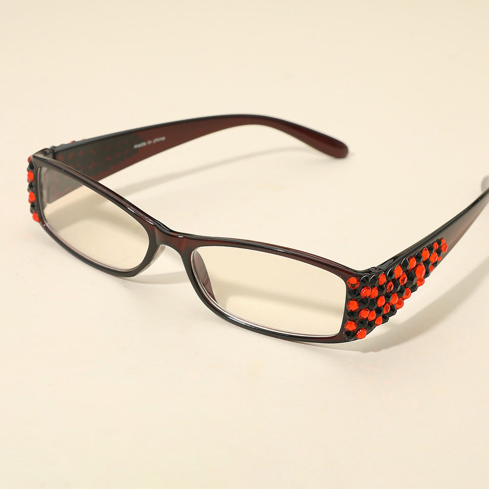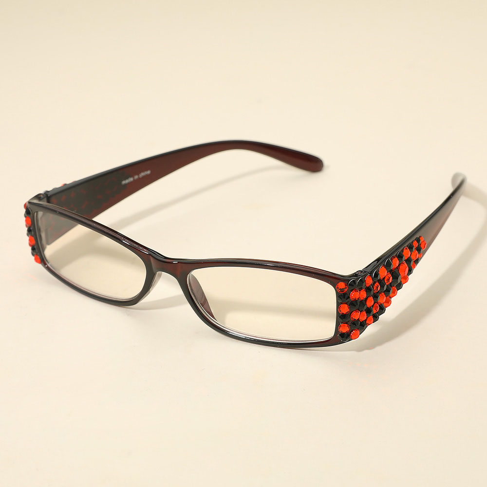 • Stylish reading glasses designed with sparkling embellishments along the frames. Offering both function and flair, they bring a touch of glamour to everyday eyewear while ensuring comfort and clarity for daily use.