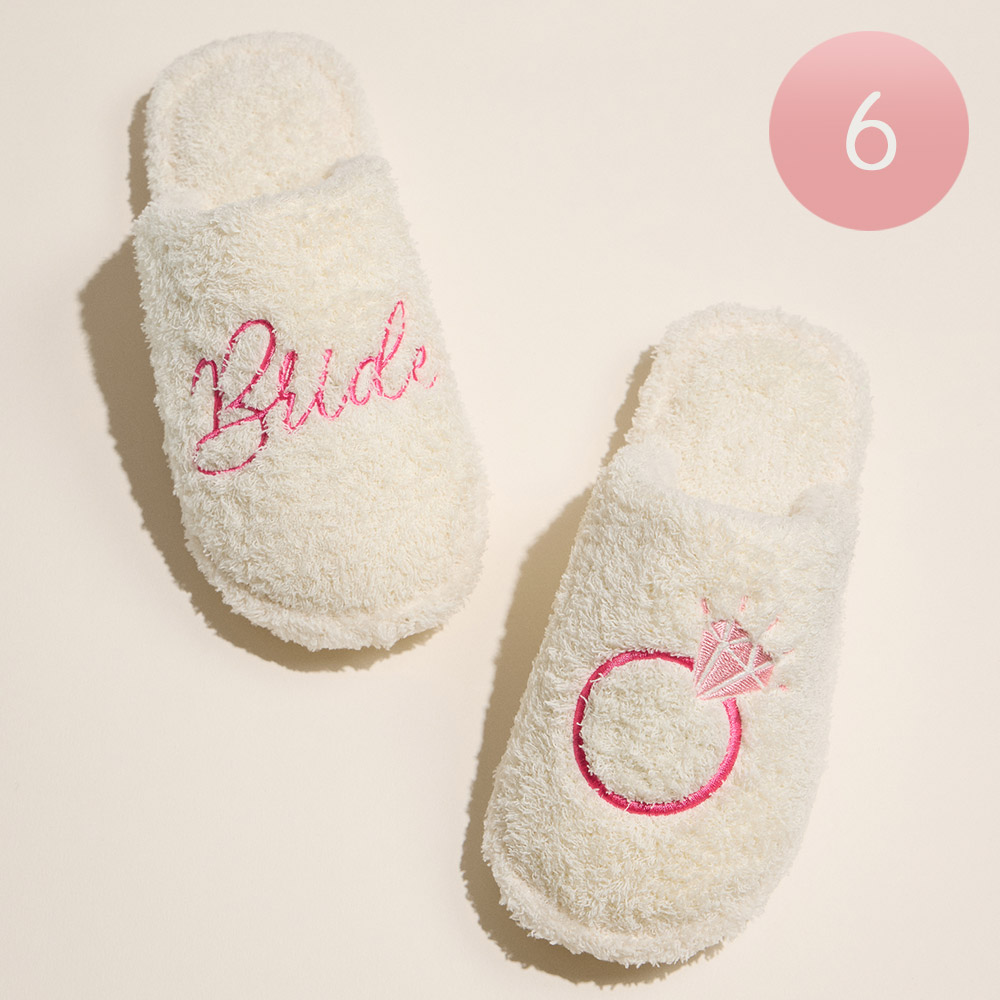 Details • Size : 6 Pairs Assorted size in each pack • 3 Small, 3 Medium • M: women size 9-10 (250mm) 40-41 • L: women size 11-12 (260mm) 42-43 • Material : 100% Polyester • Celebrate the bride-to-be with these cozy fuzzy slippers featuring “Bride” embroidery and a ring motif. Ideal for wedding prep, bridal showers, or lounging in style, they offer comfort with a fun and festive flair. A perfect gift for any bride’s special moments.