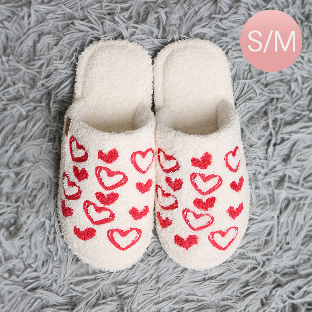 Details • Size : S/M (Women 6-8, Men 5-7) • Material : 100% Poly. Microfiber • Comfortable indoor slippers in S/M size with a charming heart pattern design. Perfect for keeping your feet warm and relaxed at home with soft texture and easy slip-on style.