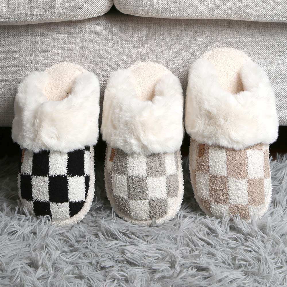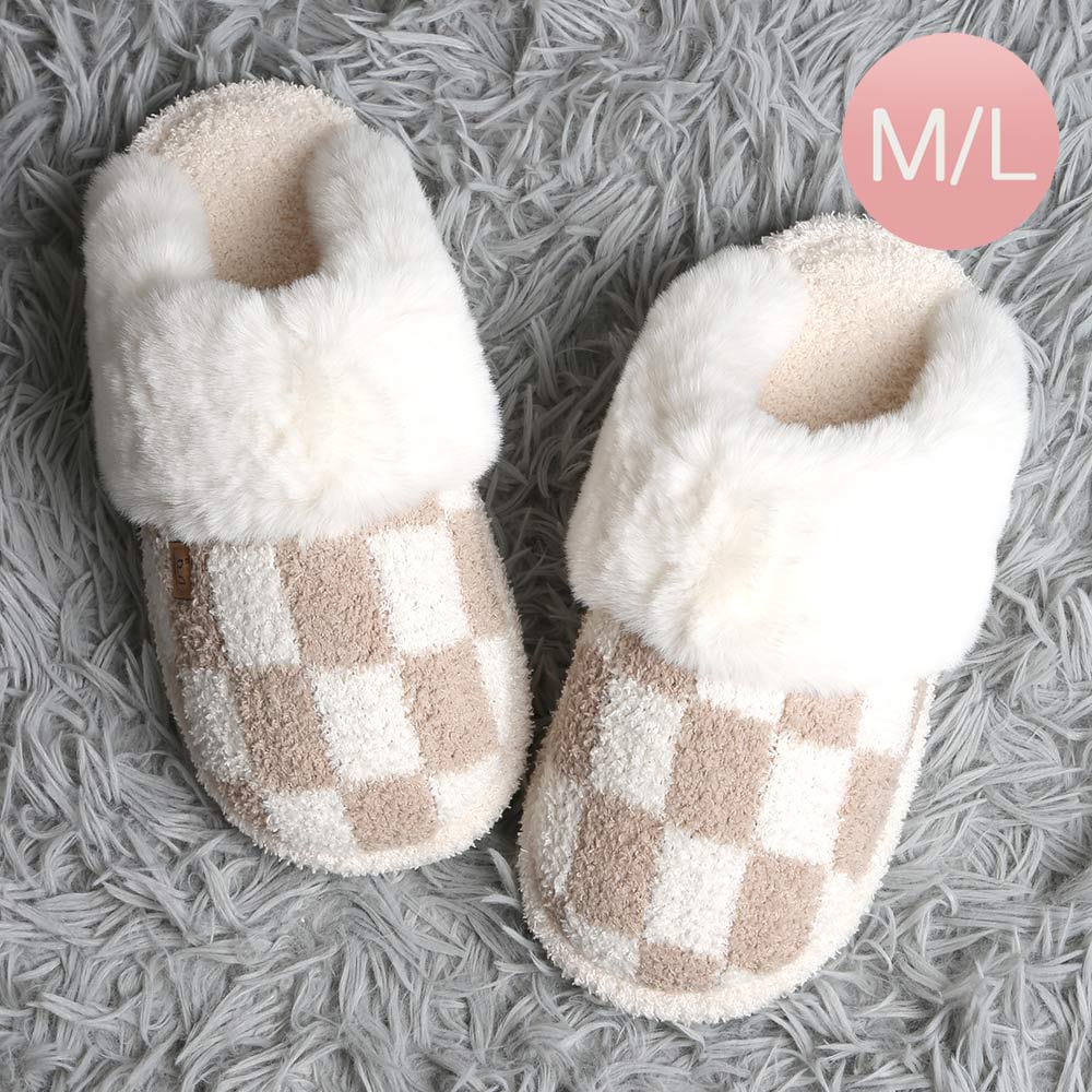 Details • Size : M/L (Women 8-10, Men 7-9) • Material : 100% Poly. Microfiber • Stay cozy with these plush checkered indoor slippers featuring a soft faux fur lining for warmth and comfort. Designed with a cushioned sole for all-day wear, they combine style and function, making them perfect for relaxing at home during colder seasons.