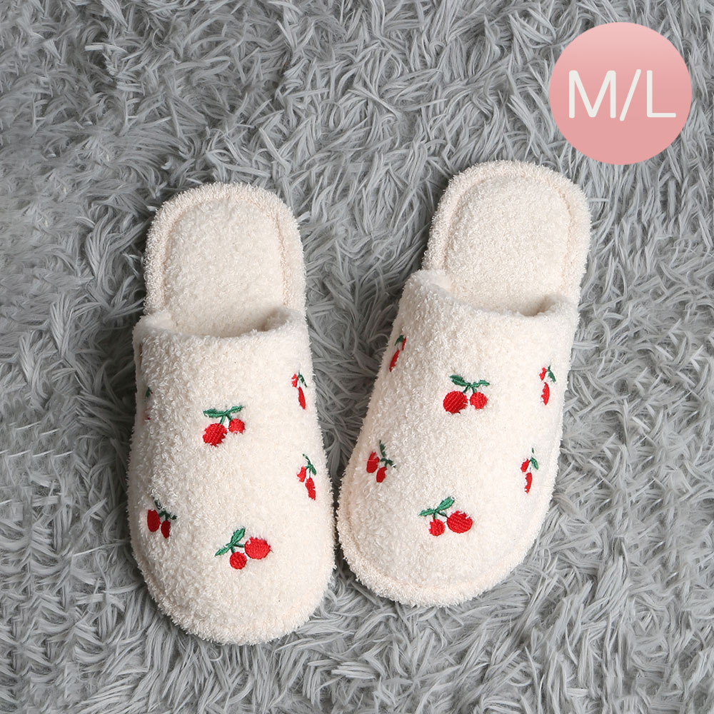 Details • Size : M/L (Women 8-10, Men 7-9) • Material : 100% Poly. Microfiber • Add charm to your lounge wear with M/L size cherry embroidered indoor slippers. Soft, cozy, and playful—perfect for relaxing at home in comfort and style.