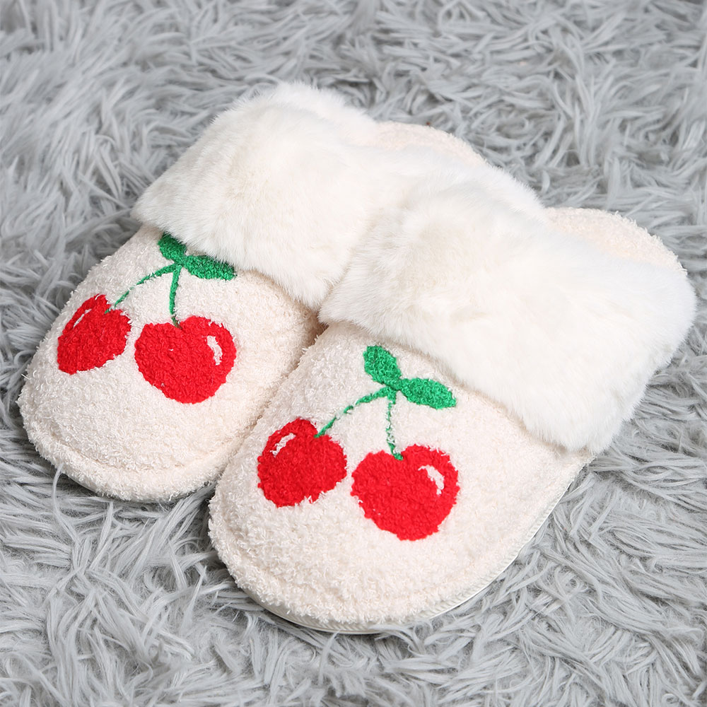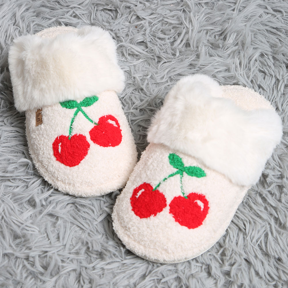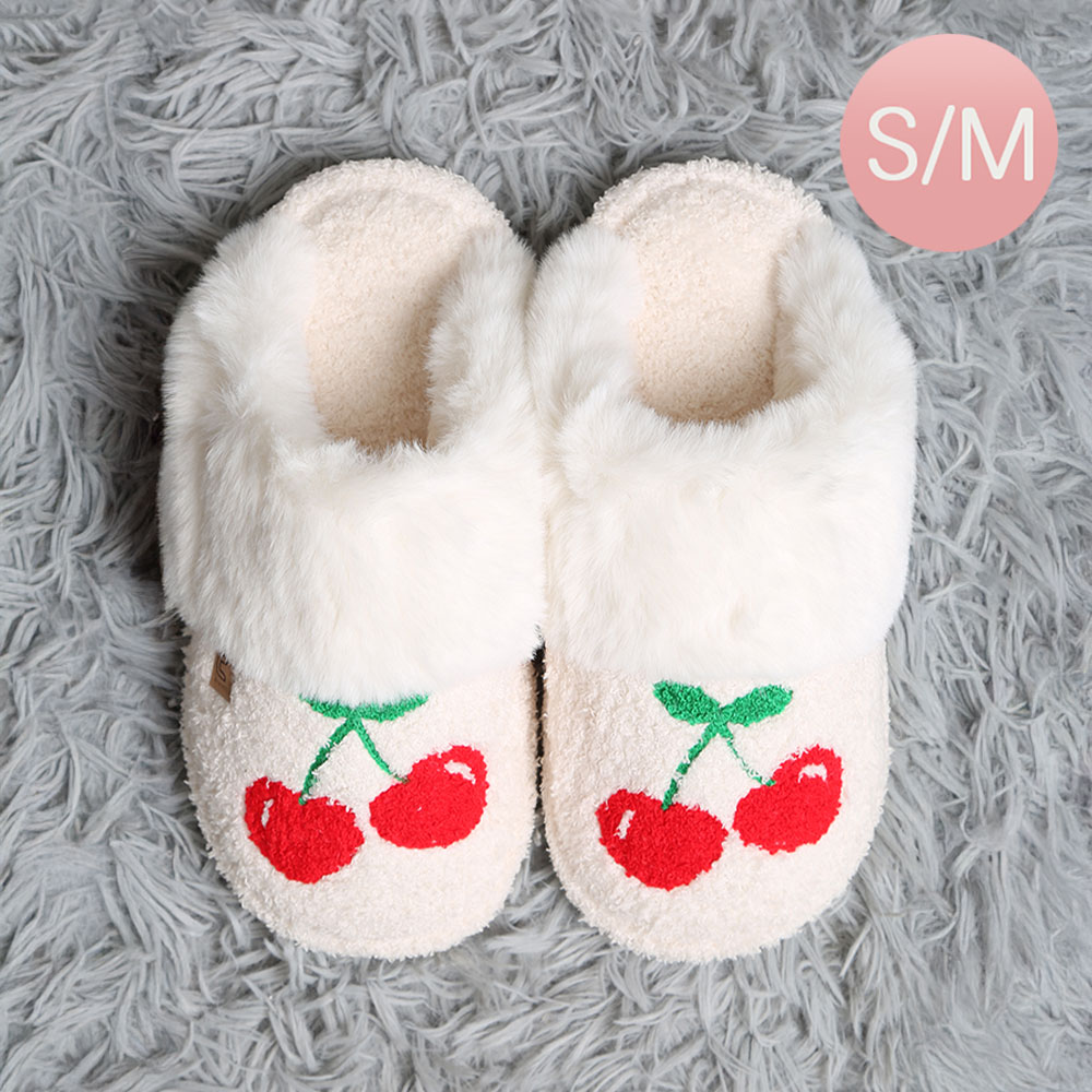Details • Size : S/M (Women 6-8, Men 5-7) • Material : 100% Poly. Microfiber • Soft and warm slippers featuring playful cherry embroidery, designed with plush lining for extra comfort. Perfect for relaxing at home while keeping your feet snug and stylish.