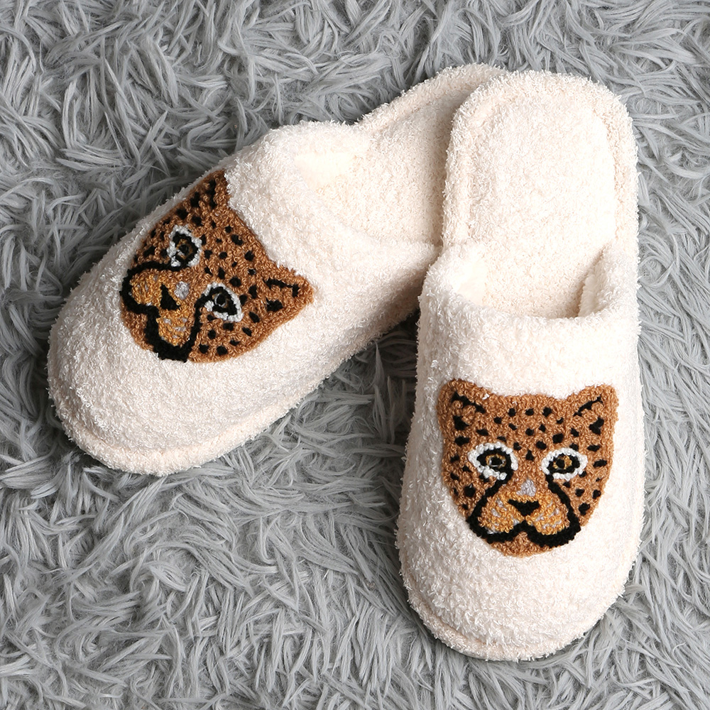Details • Size : S/M (Women 6-8, Men 5-7) • Material : 100% Poly. Microfiber • Step into comfort with these cozy indoor slippers featuring a playful leopard face embroidery. Designed for softness and warmth, they add a fun animal-themed touch to your lounging routine, making them a perfect everyday essential or gift.